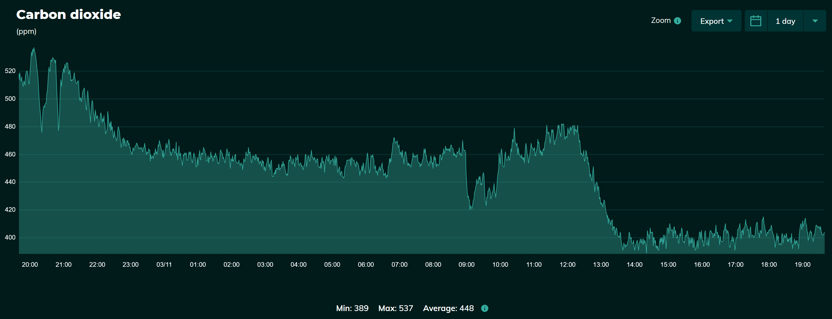 Measured with a Ruuvi Air, passed through a Ruuvi Gateway and visualised via their web app.