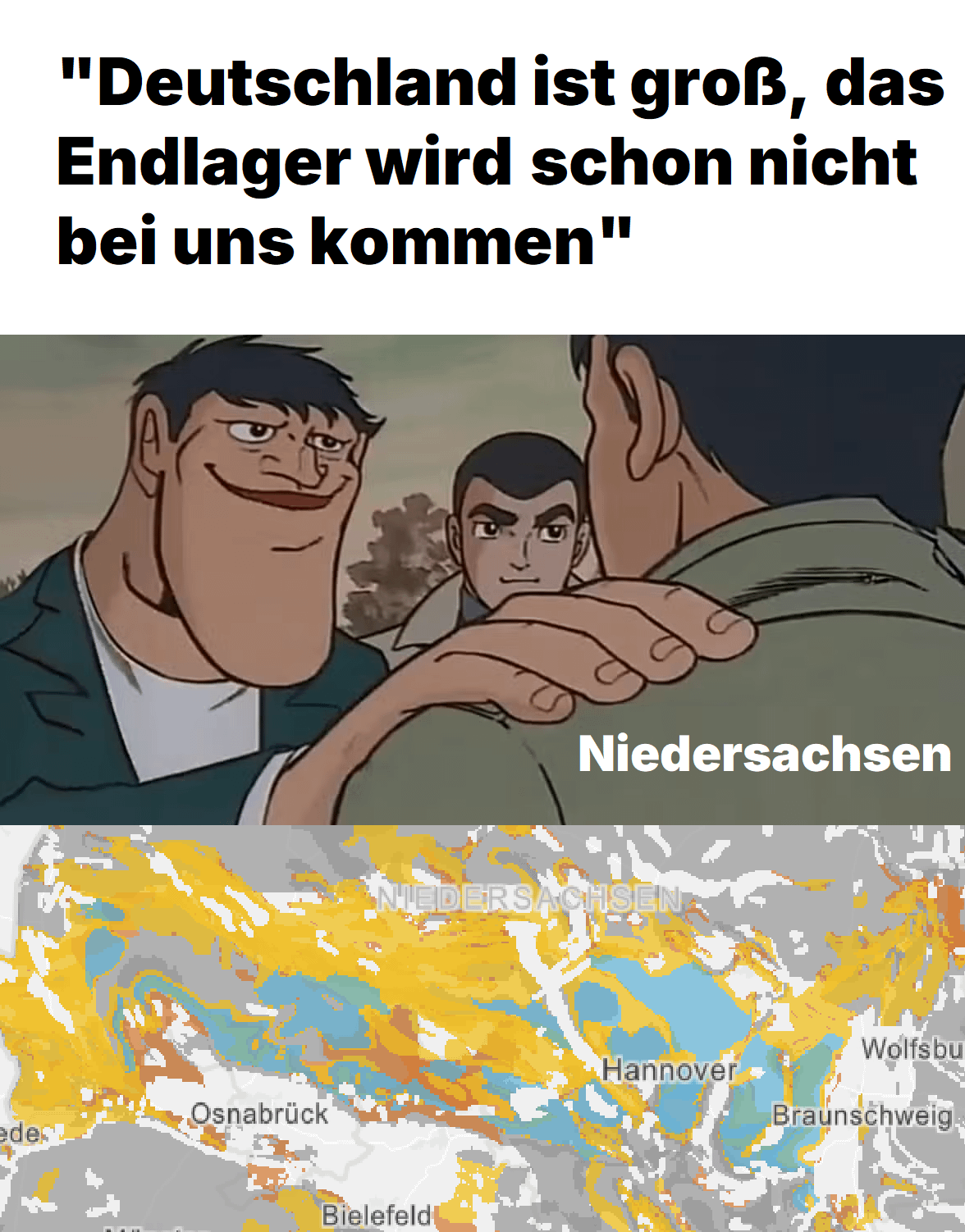 Das Endlager soll einfach dahin wo es am sichersten ist. Komme selber aus niedersachsen, aber wenns halt hier am besten geht – tough luck!
