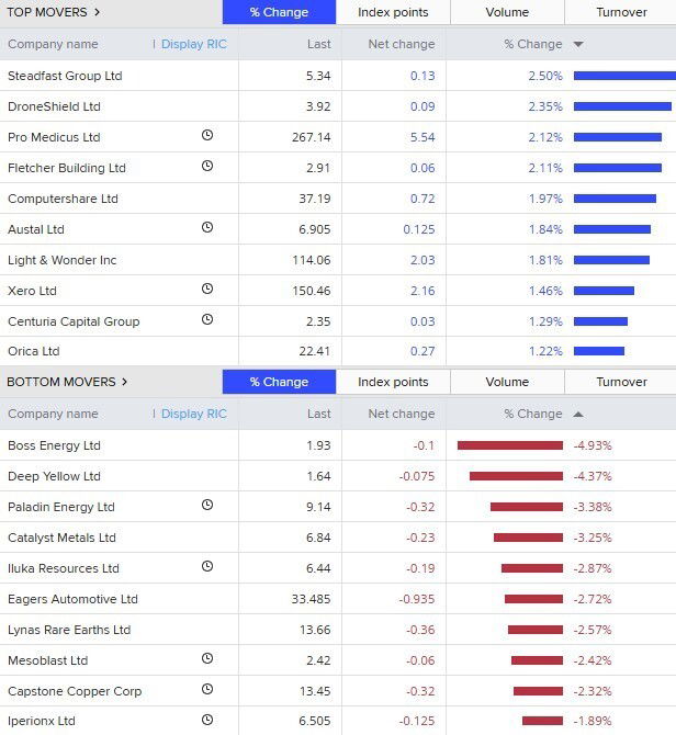 DroneShielf +5%Domino’s Pizza +3.8%NEXTDC +3.6%Austal +2.8%Light & Wonder +2.7%