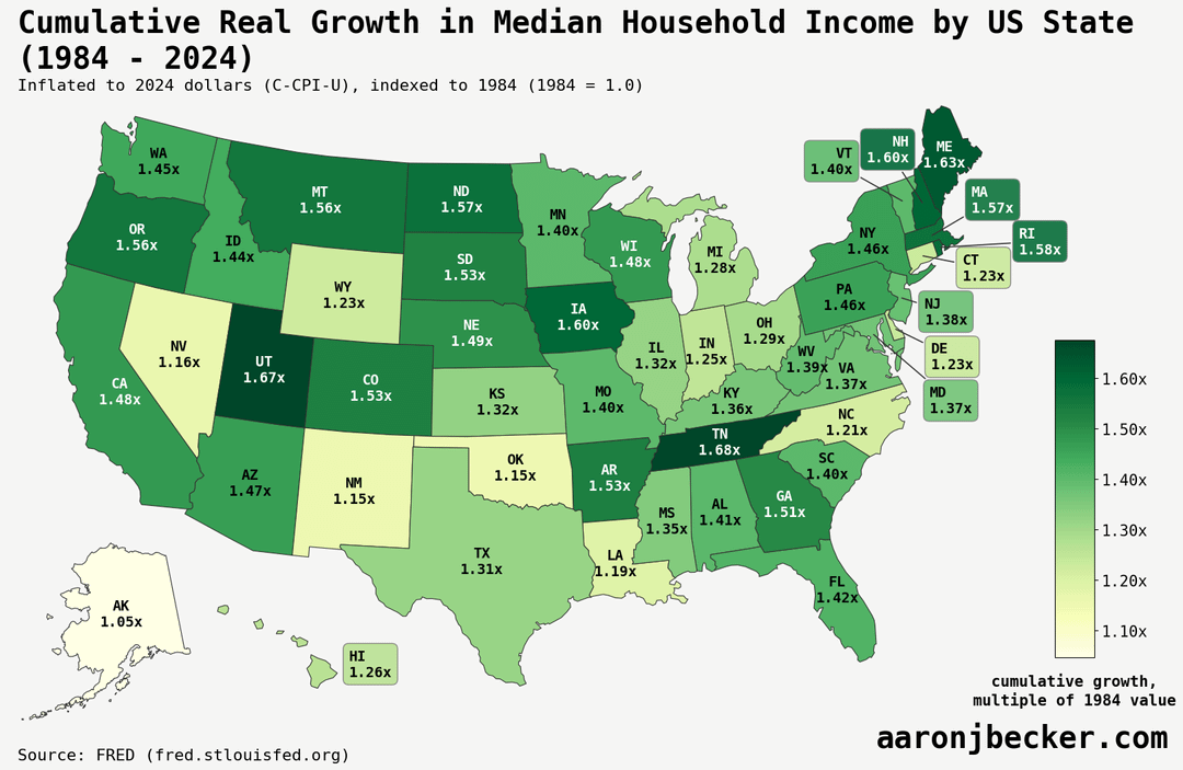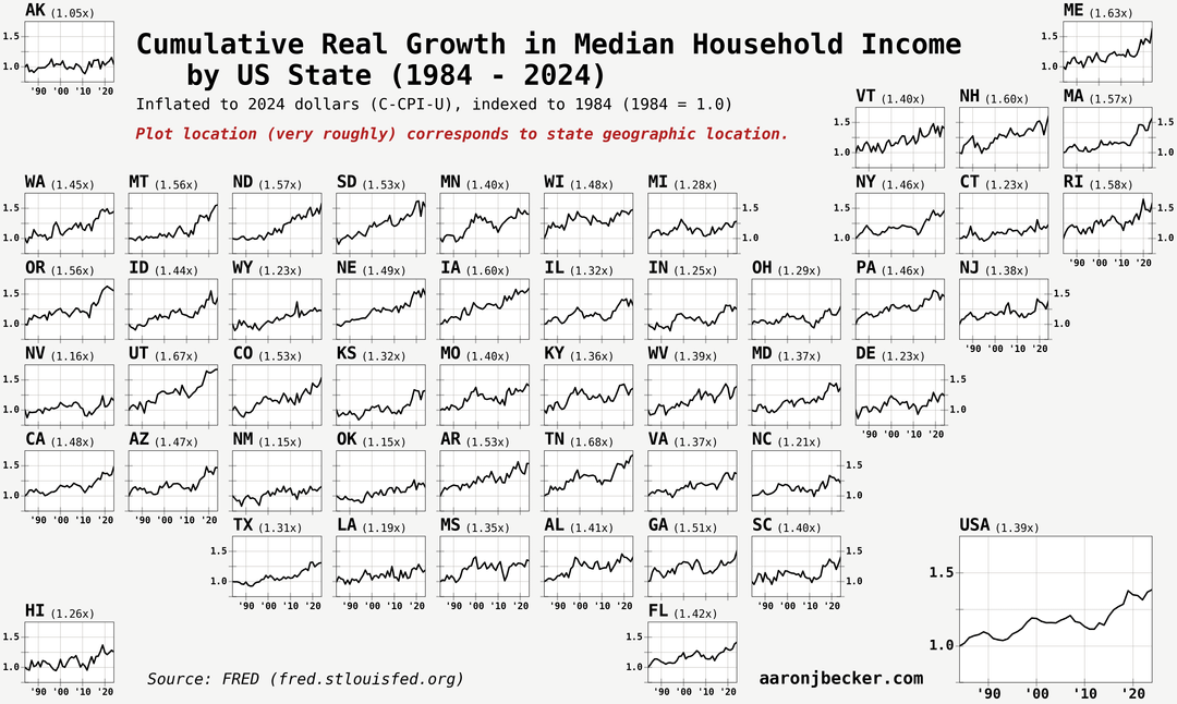 Swipe for grid cartogram with trends. Median household income is mostly relevant as a measure of housing affordability, since the only constant in what defines a household is living together. Code and analysis: https://aaronjbecker.com/posts/real-median-household-income-growth-by-state-since-1984/