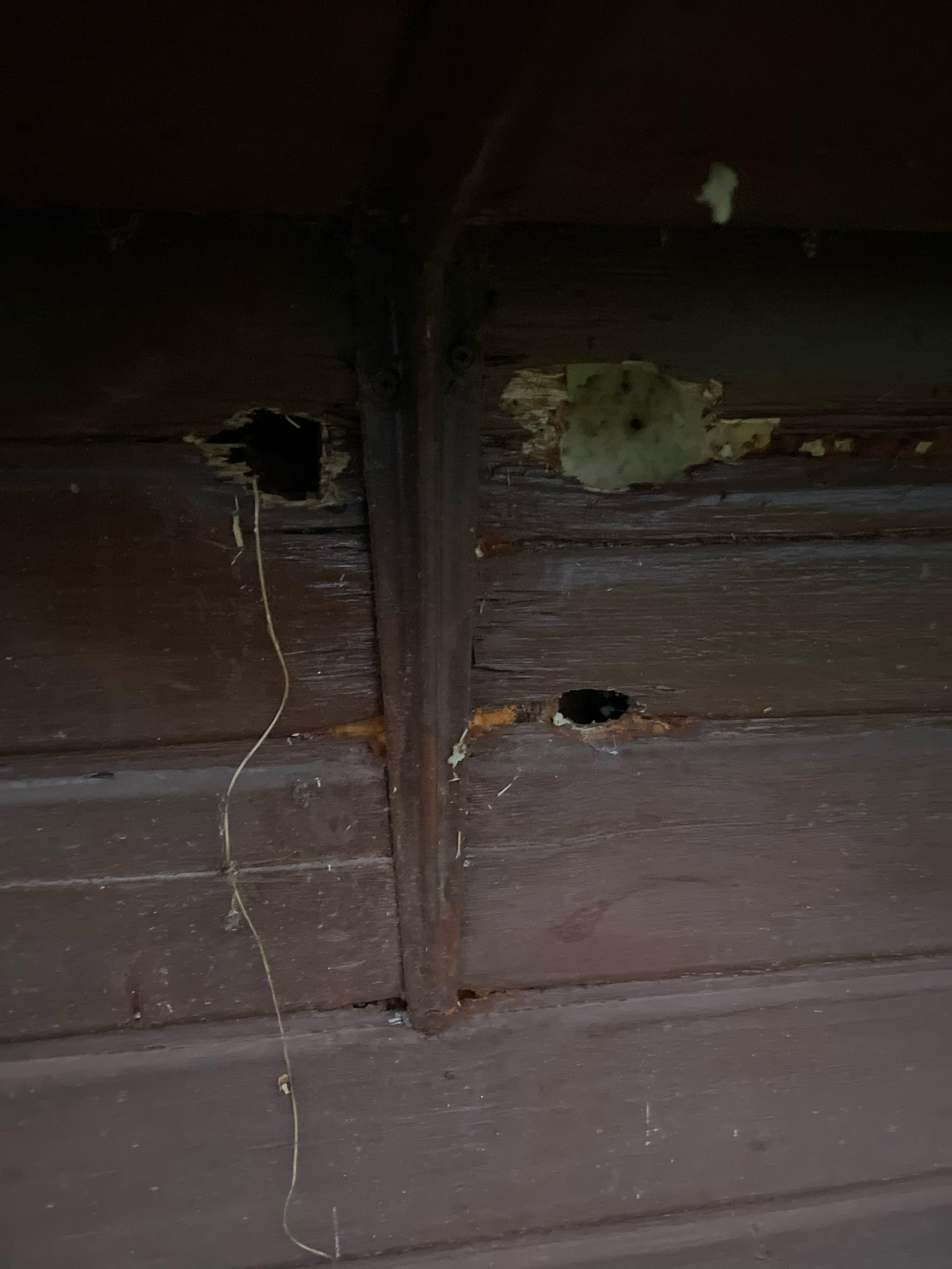 Es gibt auf Youtube ganz tolle Anleitungen, wie man Holz repariert. Bei Löchern dieser Größe würde ich sie sauber aussägen, dann ein exakt aber eng passendes Stück Holz mit Leim einsetzen/hämmern, abschleifen und die Stelle neu streichen.