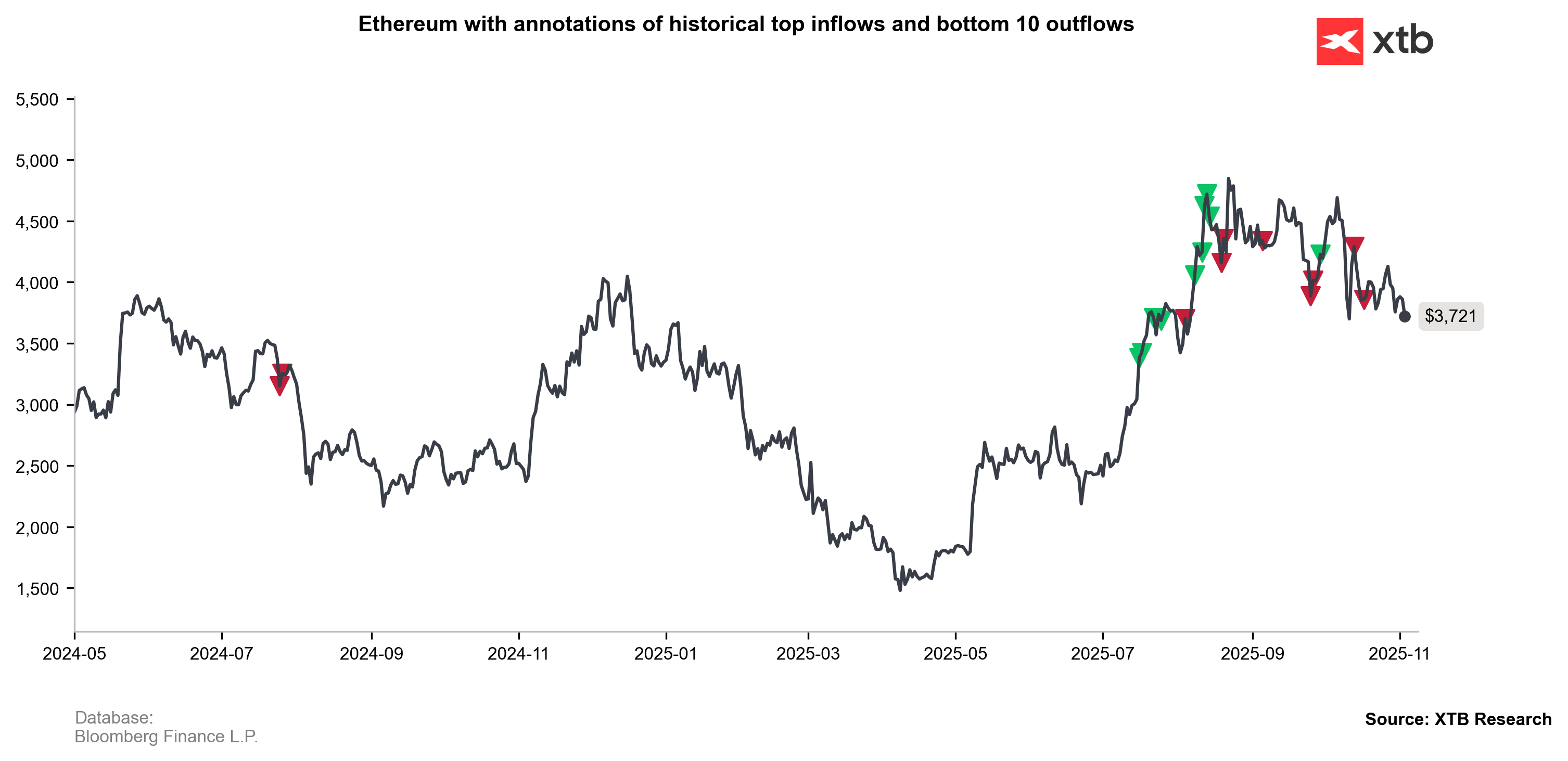Ethereum is currently under pressure, but based on historical price impulses, we can cautiously assume that market geometry supports at least a consolidation phase after the recent decline. Historically, however, drops below the 200-day EMA have almost always led to deeper sell-offs for ETH than the current one. To maintain a bullish trend, a quick rebound above $3,700 would be necessary. Otherwise, renewed pressure could push the price back toward $2,500, erasing this summer’s upward move.