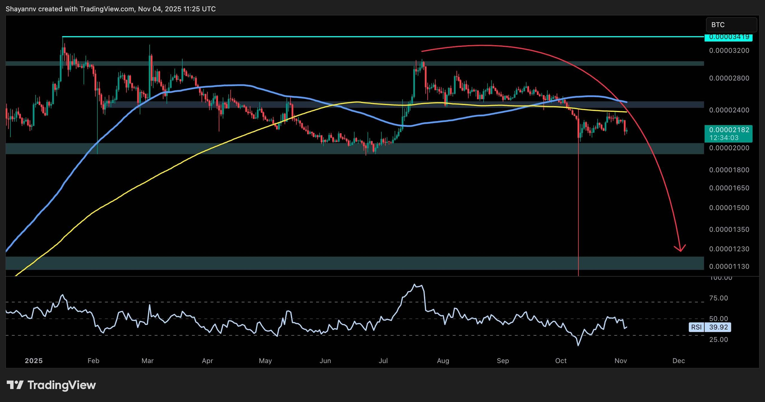 If the 2,000 sats support zone fails to hold, a rapid flush would be expected, which could push the price lower toward the 1,200 sats demand area. Momentum is also soft here, with the RSI at 39 and trending downward again, reflecting growing weakness relative to Bitcoin.