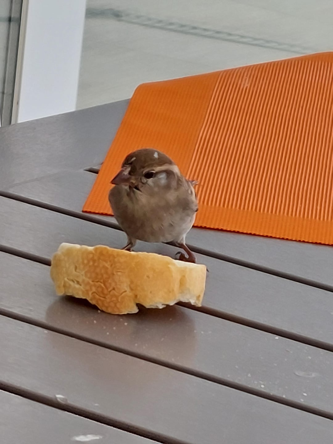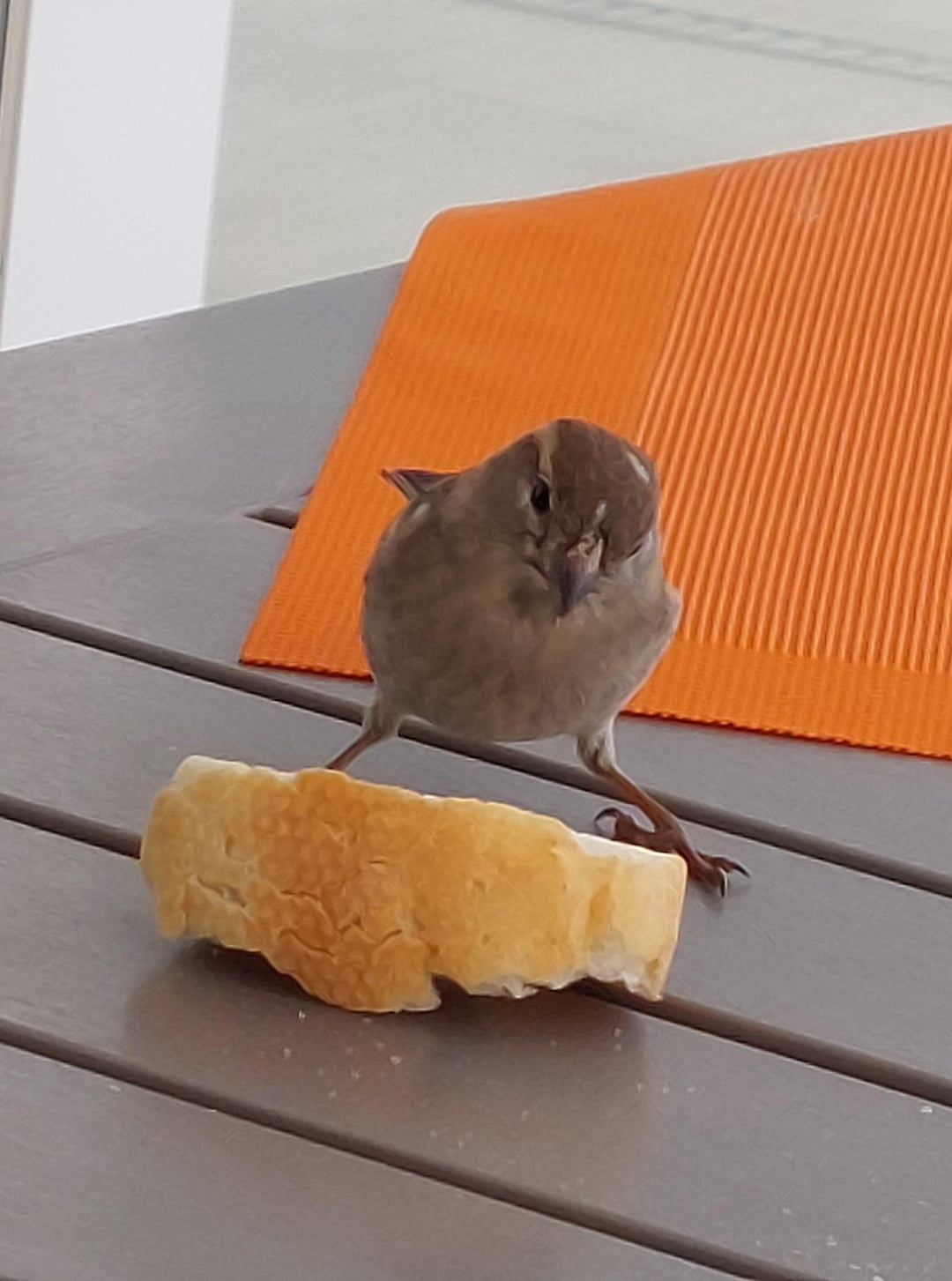 Frecher Spatz beim Frühstück auf der Terrasse