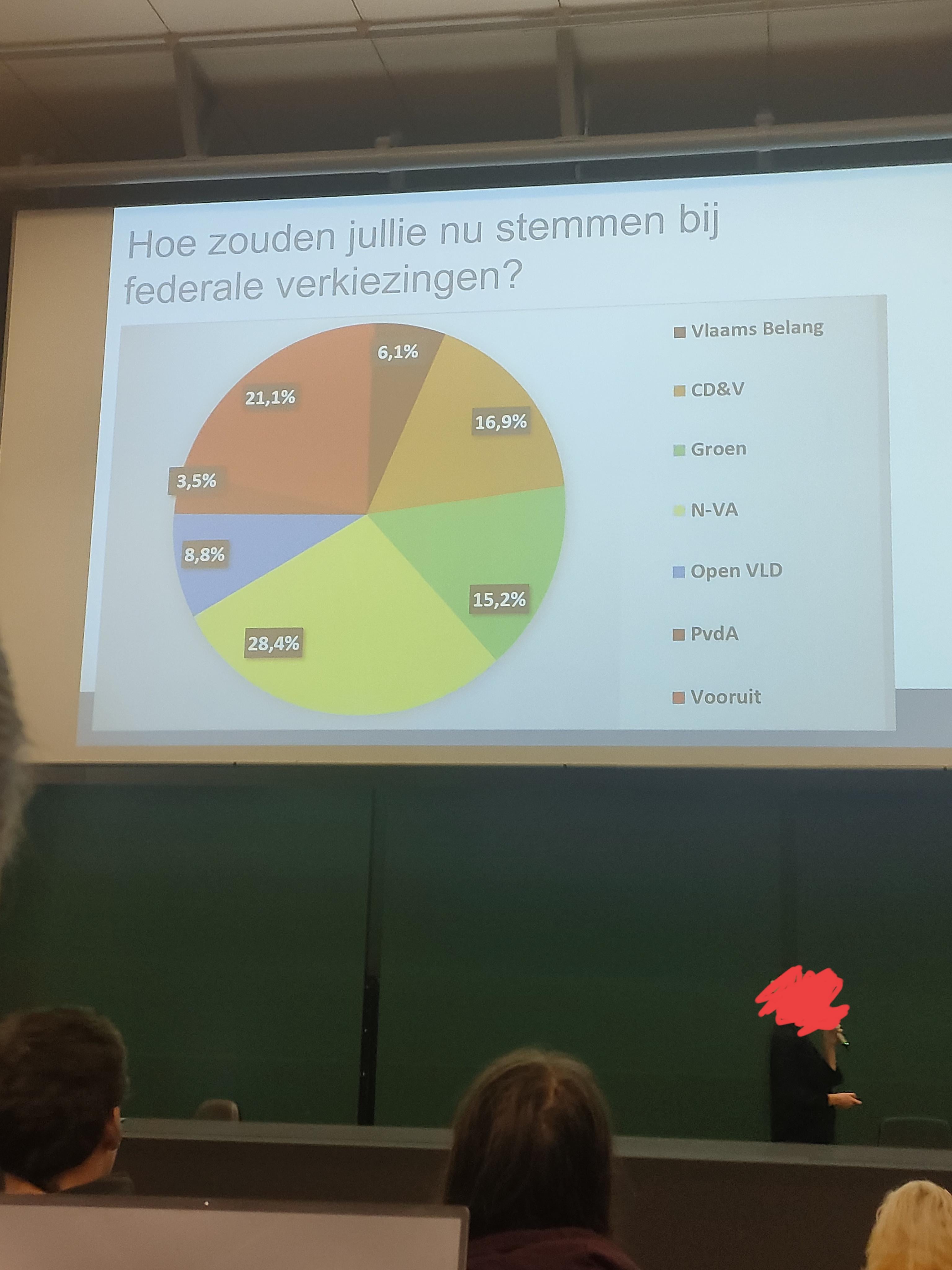 Mijn idee is dat men hier de prof zijn invloed kan vaststellen aan het klein aantal stemmen voor Vlaams Belang. « Extreem rechts » is sowieso negatief aan bod gekomen voorafgaand tijdens de lessen en studenten schamen zich om openlijk « extreem » te zijn, meestal uit angst om er niet (meer) bij te horen.