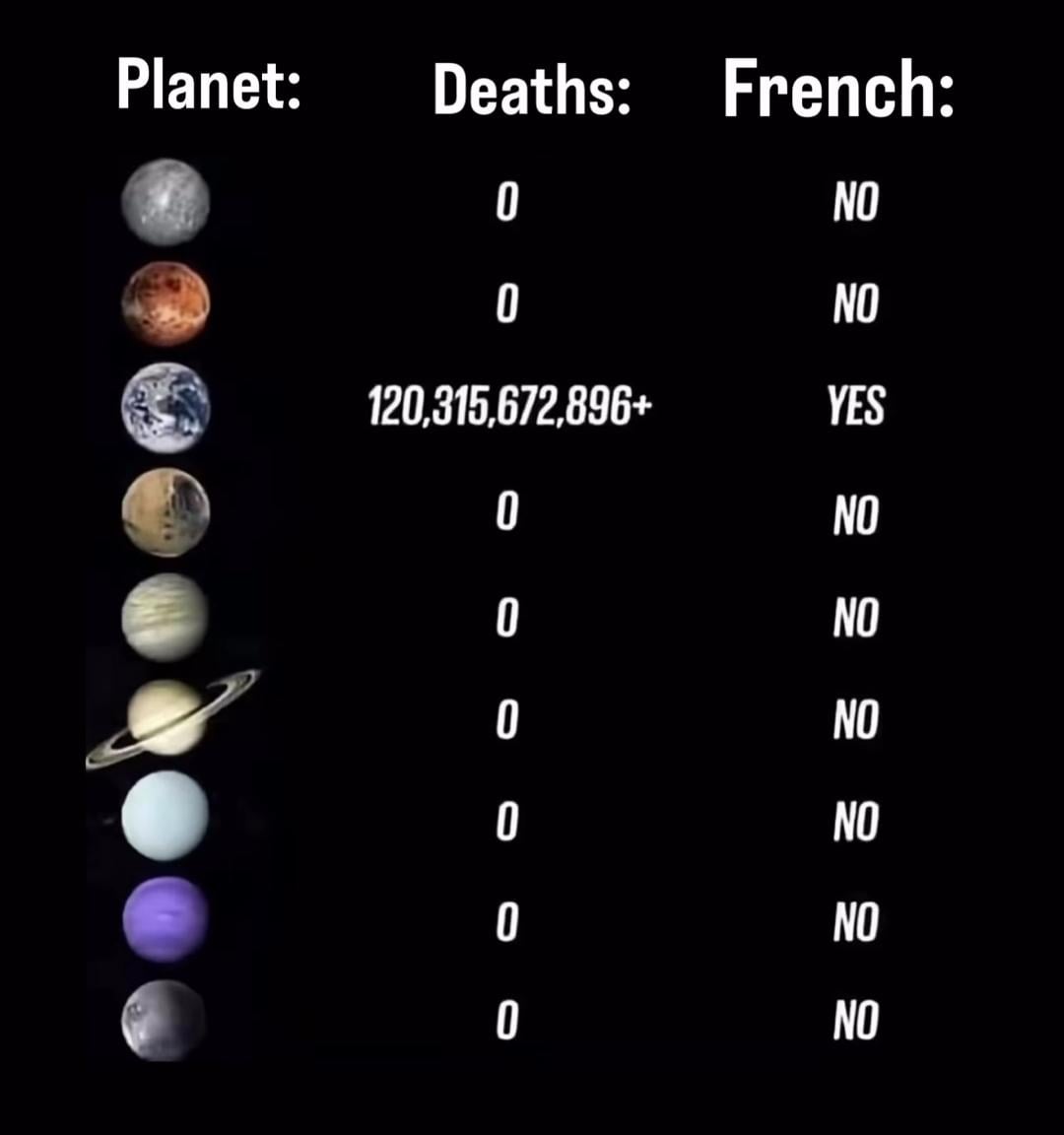 This is such a stupid ideogram. It only works because earth is the only planet with people in them. You could replace French with any other non dead language and it would look the same.