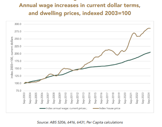 You can see it illustrated in a different way in this graph from the Per Capita think-tank, which shows how quickly property prices increased, relative to incomes, between 2003 and 2024: