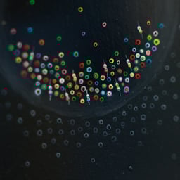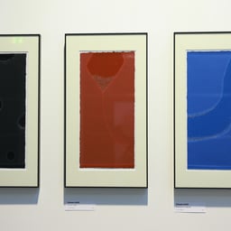 Auf den ersten Blick wirken Chikako Katos Bilder wie ruhige Farbfelder – tiefes Blau, erdiges Rot, undurchdringliches Schwarz. Erst aus der Nähe entfalten sie Bewegung: Winzige, farbige Punkte, in geduldiger Präzision gesetzt, formieren sich zu Bögen, Bahnen und Trichtern. Das erscheint minimalistisch, vibriert aber auch, so als atme das Papier selbst.