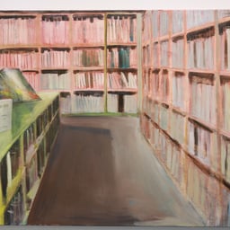 Im ersten Bild öffnet sich ein leerer Gang, von fahlem Licht durchzogen, und die Bücher erscheinen wie schemenhafte Erinnerungen. Es ist ein rhythmischer, fast hypnotischer Raum zwischen Ordnung und Auflösung, Bücher werden zu Farbfeldern, das Regal zu einer still vibrierenden Komposition aus Pastelltönen.
