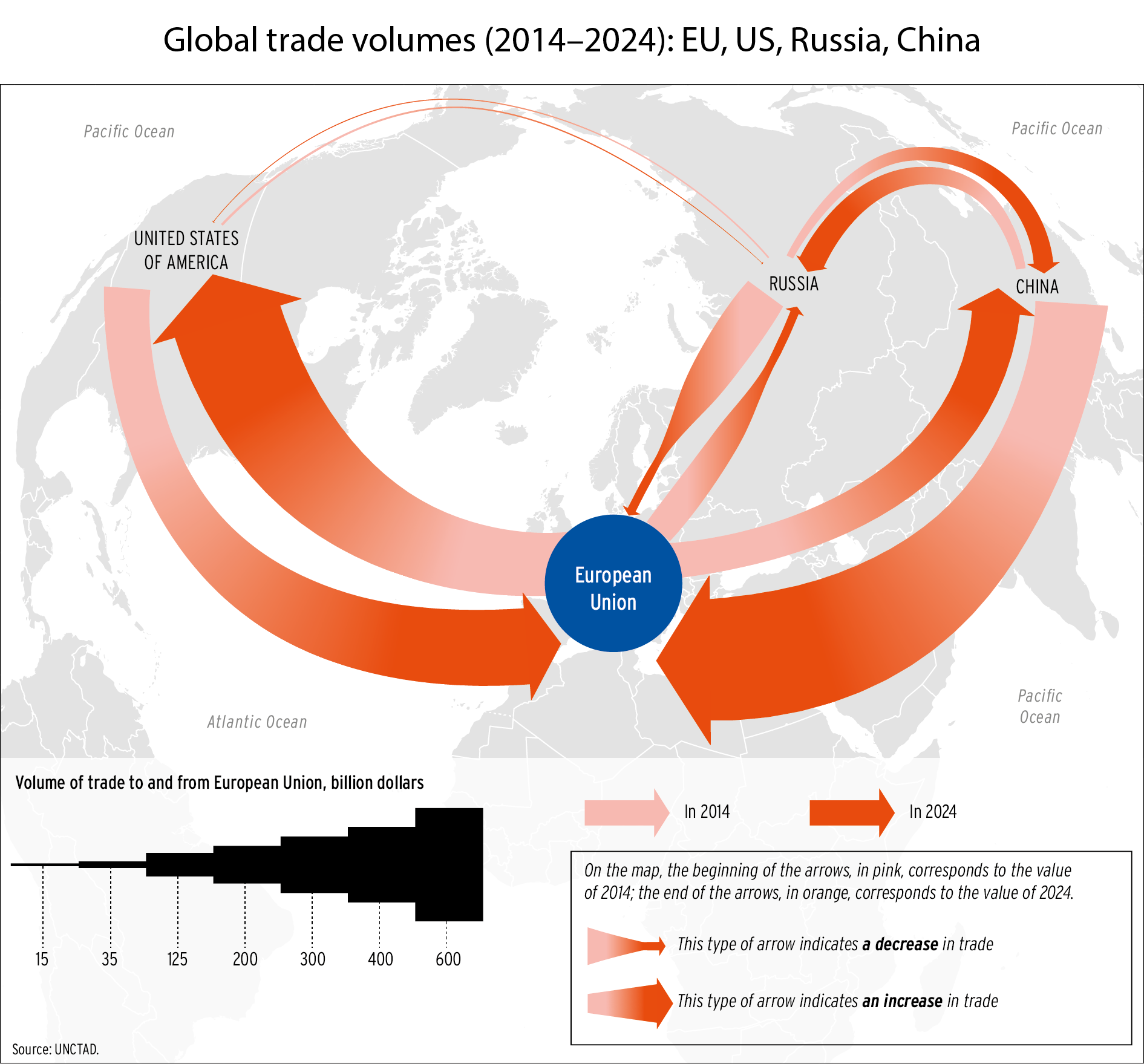 10) Europe is a magnet for all forms of exchange and movement. While its “strategic rear” is highly diversified due to its integration into the global economy, it is also more exposed. Europe depends heavily on supply chains that are vulnerable to geopolitical disruption and on increasingly uncertain transatlantic support. Meanwhile, Russia relies on an anti-Western axis that is rapidly disengaging from networks dominated by the West.