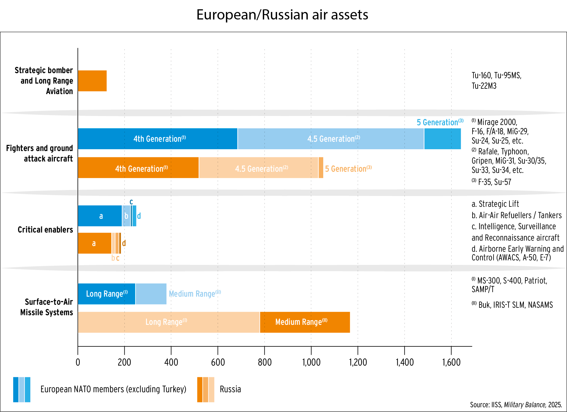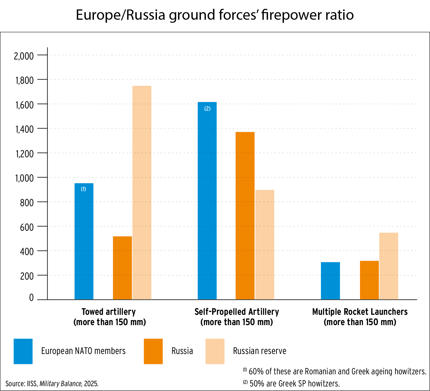 8) Analysis of the balance of power shows that the land domain remains Europe’s weak point. Even though Europe maintains a qualitative advantage in training, command and combined arms tactics, Russia has a decisive advantage in terms of mass, firepower, mobilization capacity and tolerance for attrition. In the air domain, Europe benefits from a clear quantitative and qualitative superiority. However, without massive support from the United States, maintaining European air superiority would require addressing deficits in terms of stocks, integrated air and missile defense, and capabilities to neutralize enemy air defenses. At sea, in space and in cyberspace, Europe also holds the advantage, provided it exploits this by shifting the confrontation into these domains, where Russia’s ability to deny or obscure its actions is more limited.