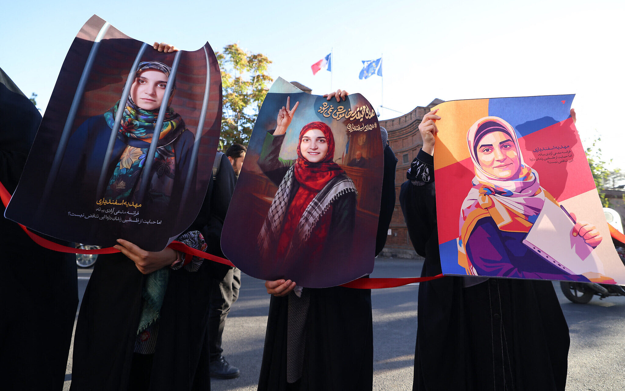 Protesters hold portraits of Mahdieh Esfandiari, an Iranian woman who was arrested in France in February, during a rally calling for her release outside the French embassy in Tehran, Iran, on October 21, 2025. (ATTA KENARE / AFP)