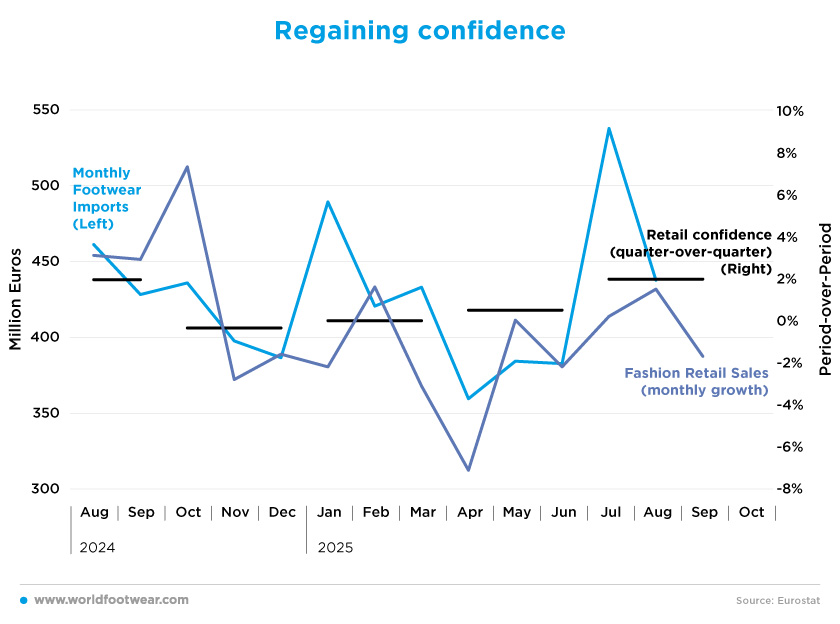 Regaining confidenceIn the first eight months of 2025, Spain imported shoes worth 3.45 billion euros, totalling 259 million pairs. This resulted in an average price of 13.28 euros per pair. These figures represented a 5.9% increase in value and an 8.4% increase in volume, resulting in a 2.3% decrease in the average price.