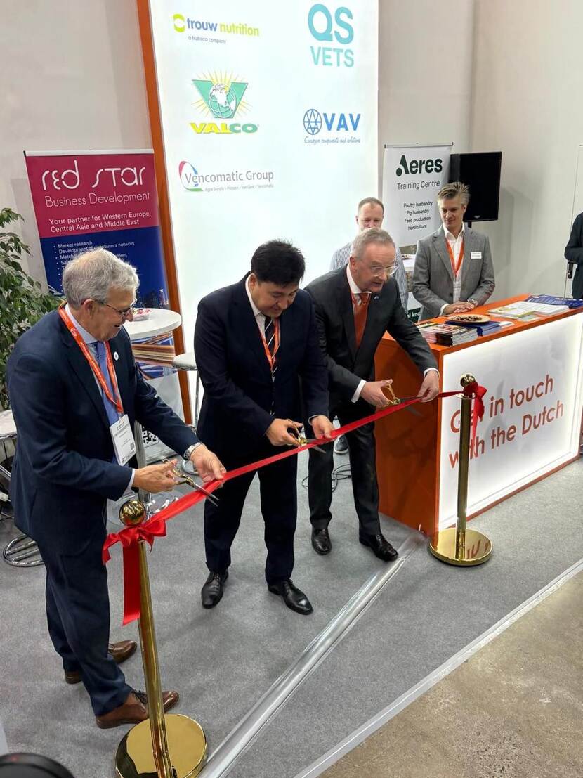 Following the ceremony, the Dutch Pavilion was officially opened by Mr. Wolleswinkel, President of the Dutch Poultry Centre, together with Arie Veldhuizen, Agricultural Counsellor of the Netherlands to Kazakhstan, and Aslan Abdraimov, Vice Minister of Water Resources and Irrigation of Kazakhstan.