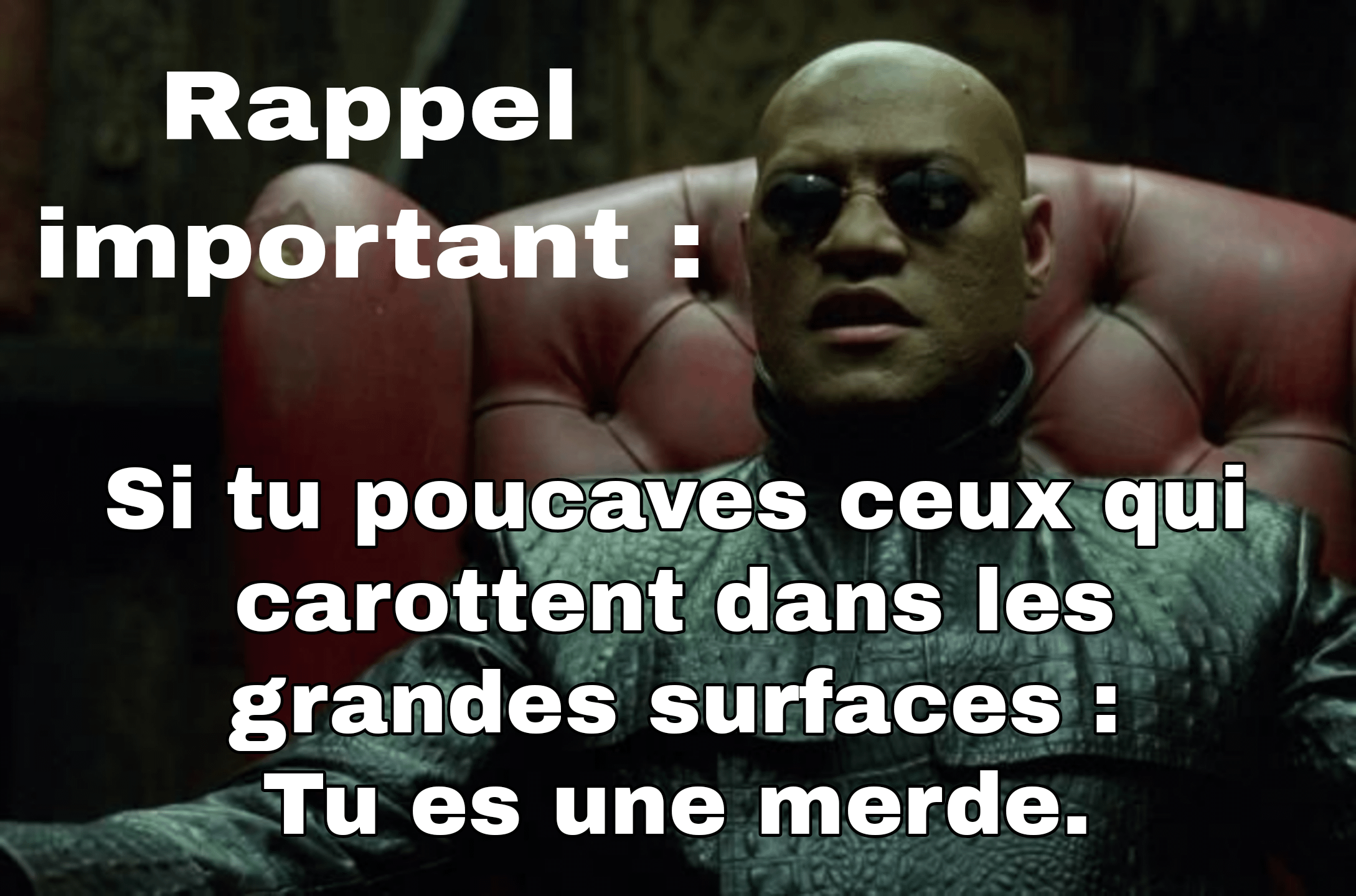 Par contre, en tant qu’employé de grande distri perso, et je pense surtout aux collègues hôte.sse de caisse: venez pas leur casser pas les noisettes si vous vous faites pécho. C’est leurs tafs de vous demander d’ouvrir vos sacs ou je sais pas quoi parce que c’est iels qui vont se faire démonter si iels le font pas.