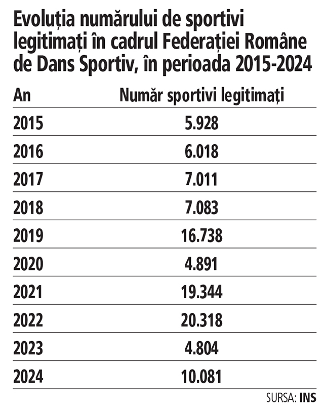 ♦ Federaţia Română de Dans Sportiv numără peste 140 de structuri sportive asociate instituţiei, cu un număr total de 10.000 de sportivi legitimaţi în 2024.