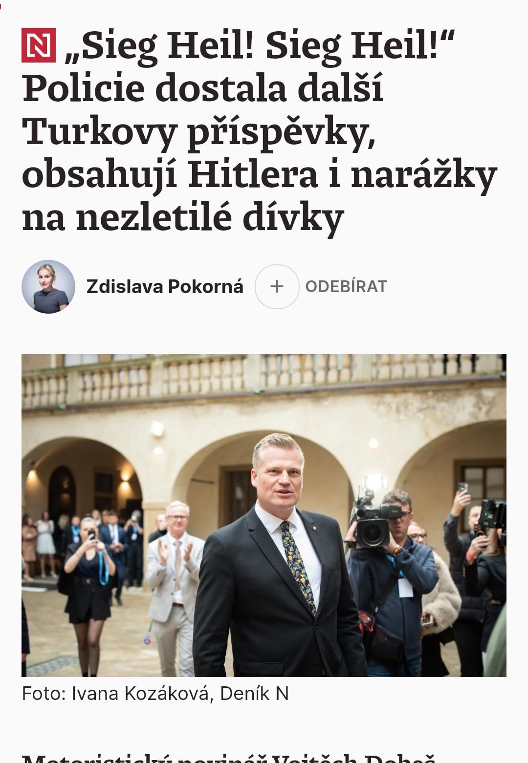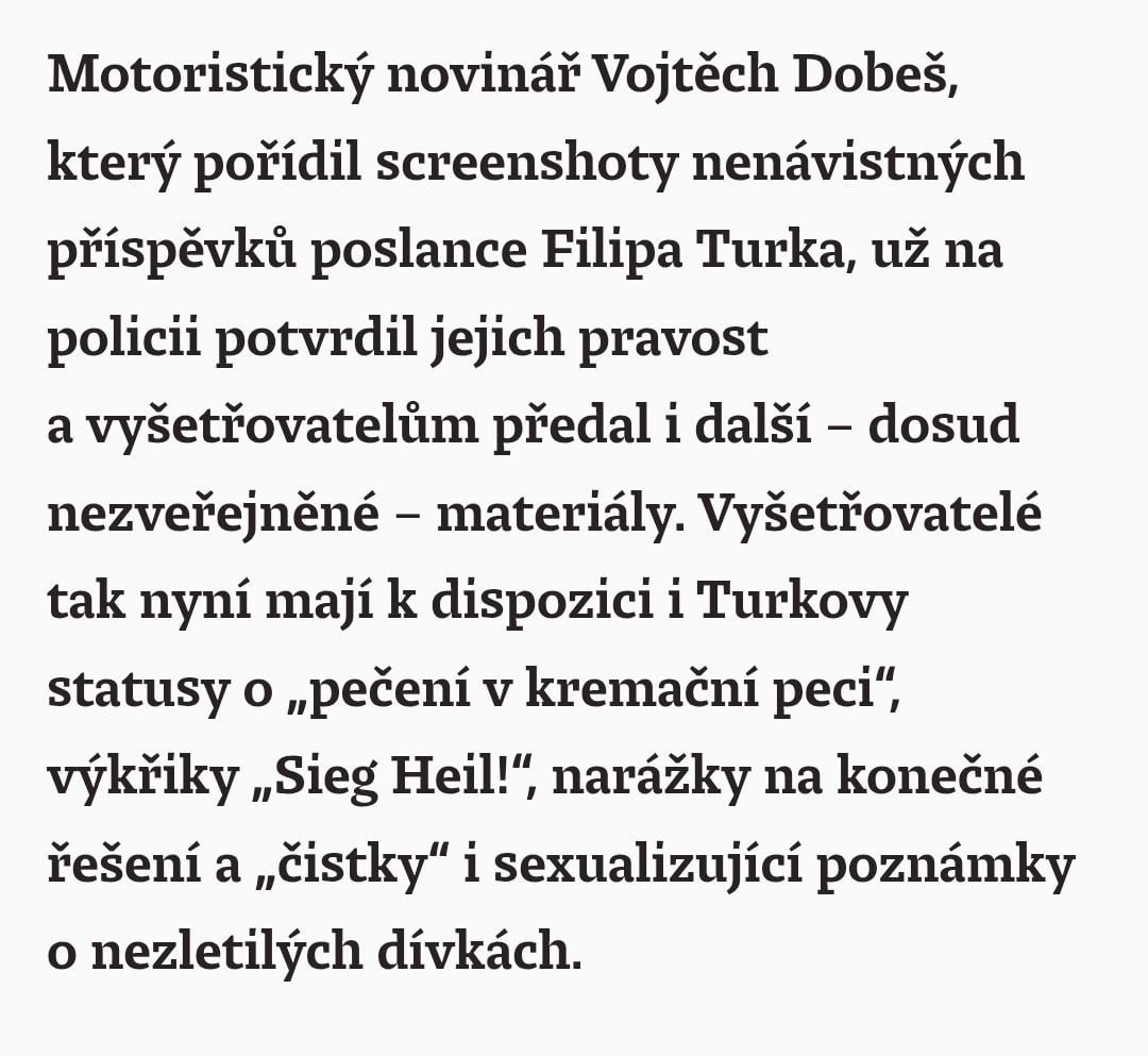 2. Mezi nově zajištěnými materiály je i status z června 2016 pořízený v Turkově bytě: na fotografii běží na televizi záběr na Adolfa Hitlera, před obrazovkou hoří svíčky a na stole stojí trofeje. Turek k tomu napsal, že „větší romantika z Orlího hnízda snad již sálat nemůže“. V následné diskuzi připojil komentáře, v nichž píše, že „jediné řešení je konečné 😉 😉 čistka…“.