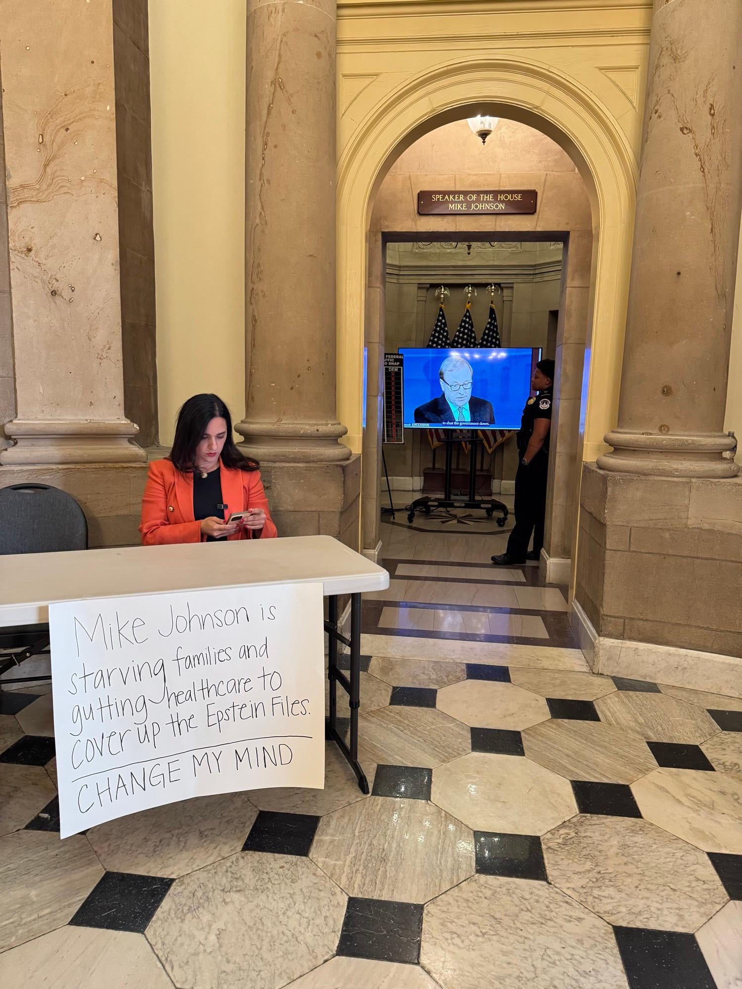 5. “Speaker Johnson, Speaker Johnson! The table that you just walked past 7 times saying that you are… <checks notes> starving families and gutting healthcare to…<checks notes again> cover up the epstein files. It says that on the large sign hanging from the table that Representative Ansari has set up and asking for anyone to debate. What are your thoughts on that?”