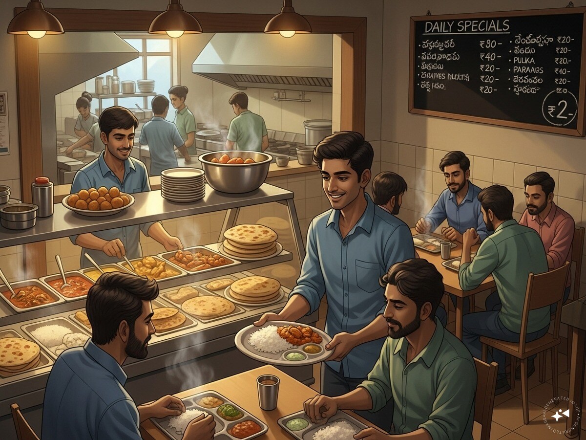 Across metropolitan and tier-II cities, more couples are working full-time jobs, leading to reduced home cooking. With middle-class and affluent families turning to nearby eateries, tiffin services, and online food delivery, the humble curry point, offering home-style curries at pocket-friendly prices, is fast emerging as a dependable source of income for small investors. (AI-Generated Image)