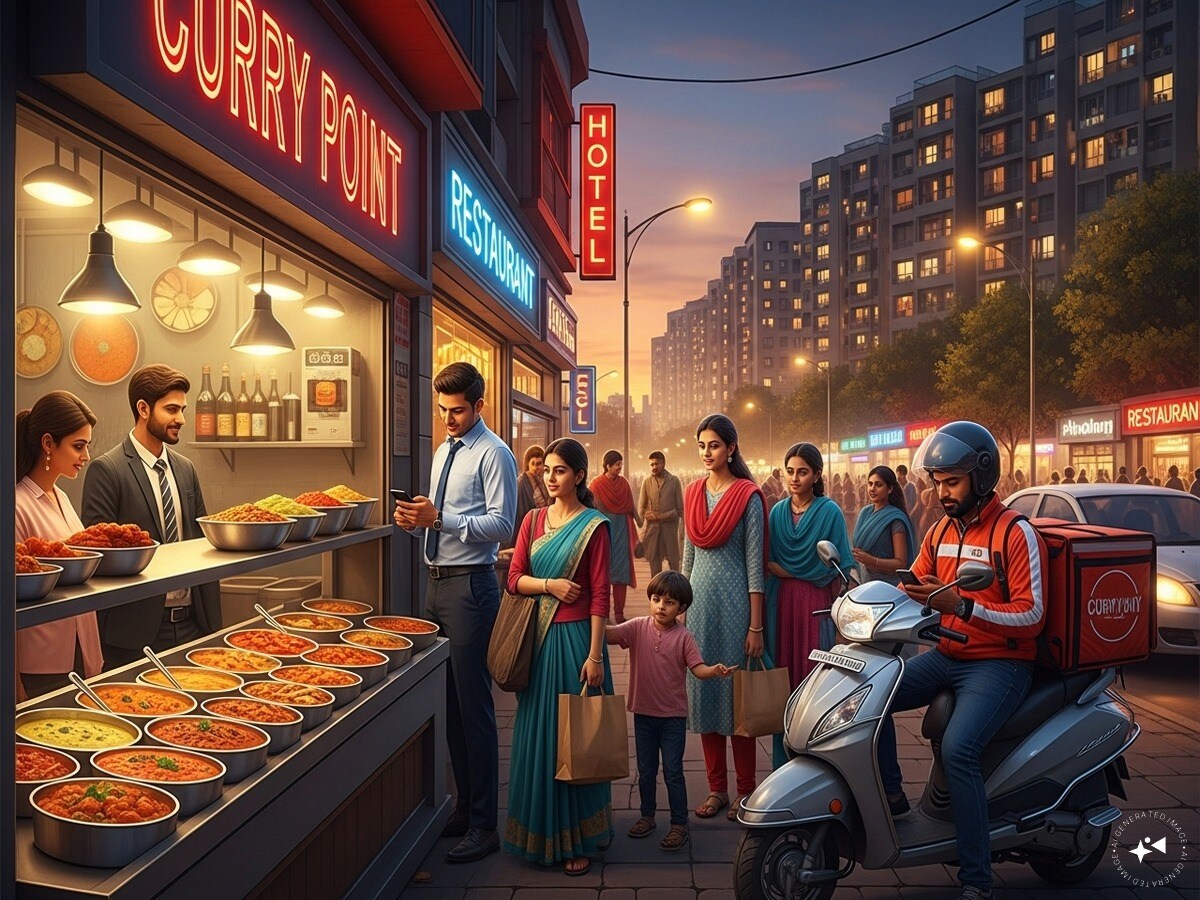 Across metropolitan and tier-II cities, more couples are working full-time jobs, leading to reduced home cooking. With middle-class and affluent families turning to nearby eateries, tiffin services, and online food delivery, the humble curry point, offering home-style curries at pocket-friendly prices, is fast emerging as a dependable source of income for small investors. (AI-Generated Image)