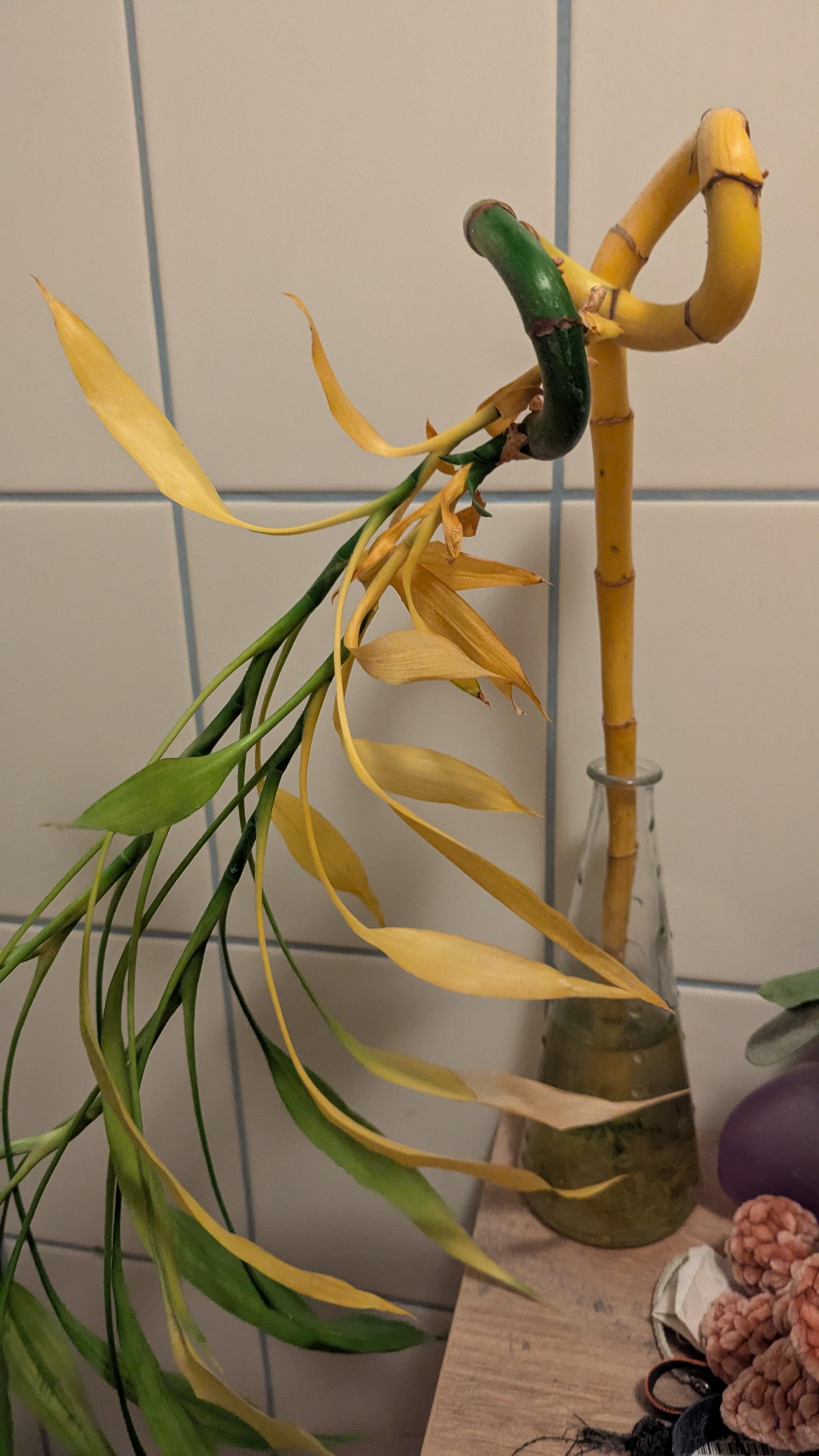 Ich bin sehr erschrocken – weil es ihm die letzten 7 Jahre super ging und er nie etwas hatte. Er hat von Anfang an in einer Vase gelebt (so hatte ich ihn auch gekauft). Bis ich weggefahren bin war er durchweg grün und stand wie eine Eins.