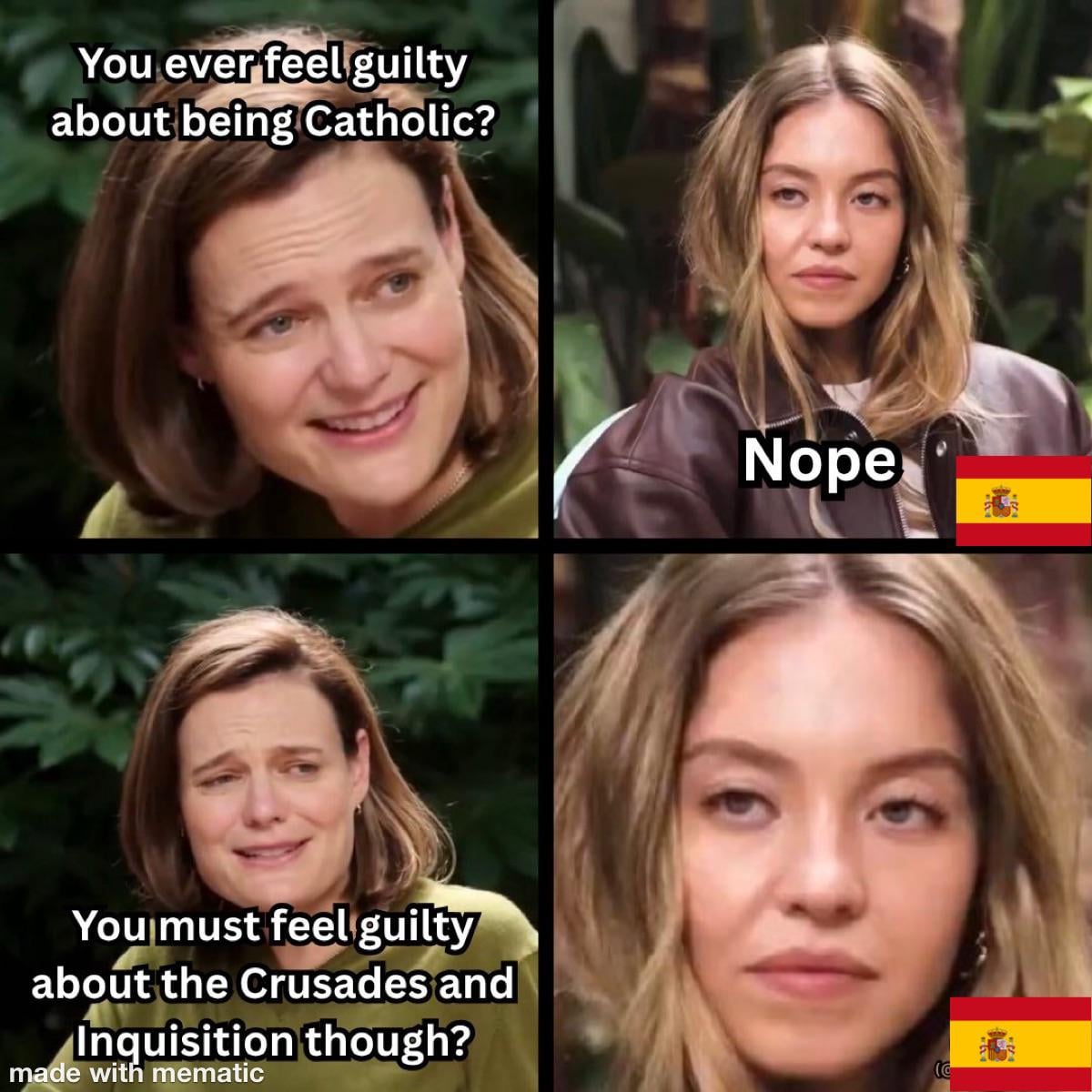 Why should she fell guilty about the crusades, though? Spain didn’t exist back then, and what kingdoms existed where more concerned with doing a little border readjustment with their own local muslims.