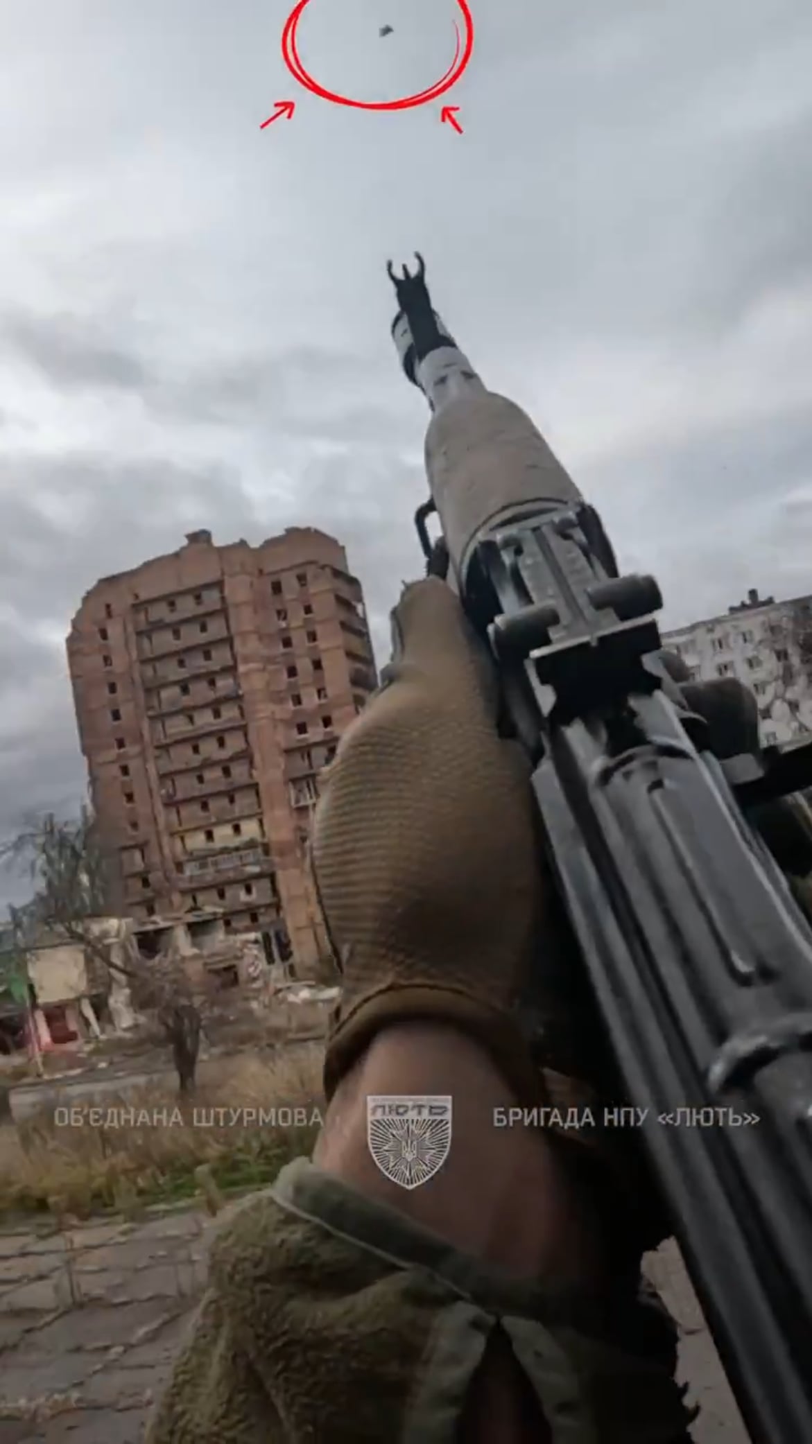 Ukrainian soldier shot down a Russian FPV drone that was targeting a friendly vehicle in Kostiantynivka, Donetsk Oblast. National Police Brigade “Liut”. Published 07.11.2025