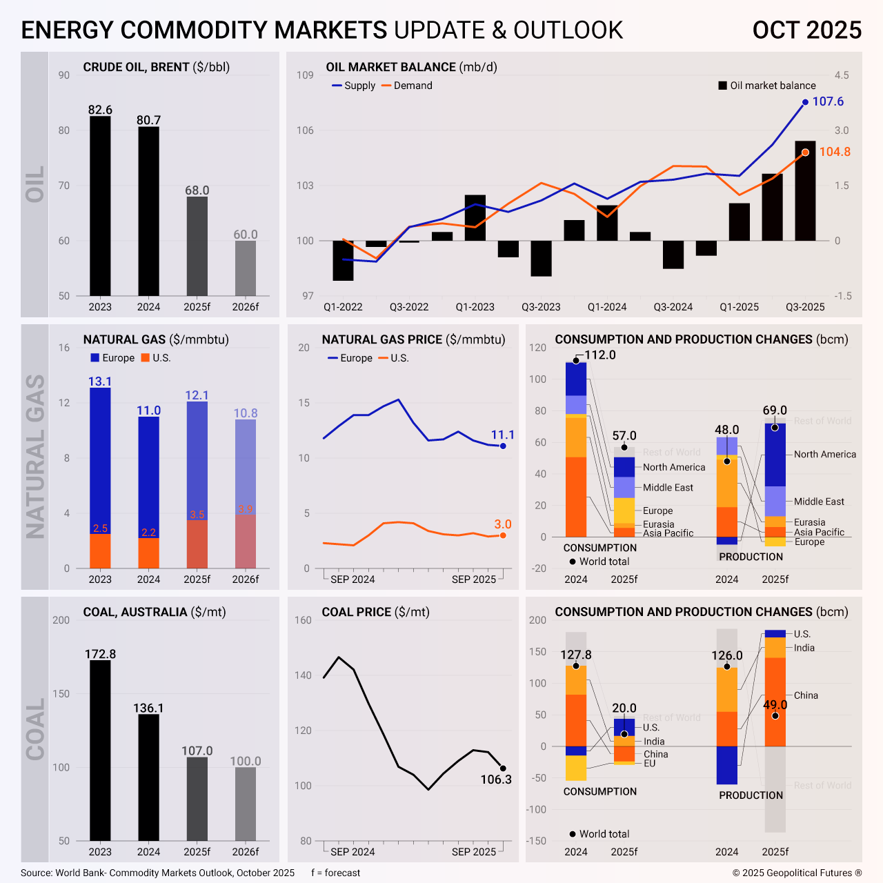 The World Bank predicts a widening imbalance between supply and demand in the energy market in 2026. Rising oil output, particularly from OPEC+ countries that are gradually restoring production volumes previously withdrawn under voluntary cuts, could exacerbate the glut and place additional downward pressure on prices. However, there is little reason to expect that rising supply will be met with equivalent demand. Global economic growth remains slower than expected, constrained by trade tensions and political uncertainty. China, a key energy consumer, is still experiencing a slowdown in purchasing, keeping demand subdued.