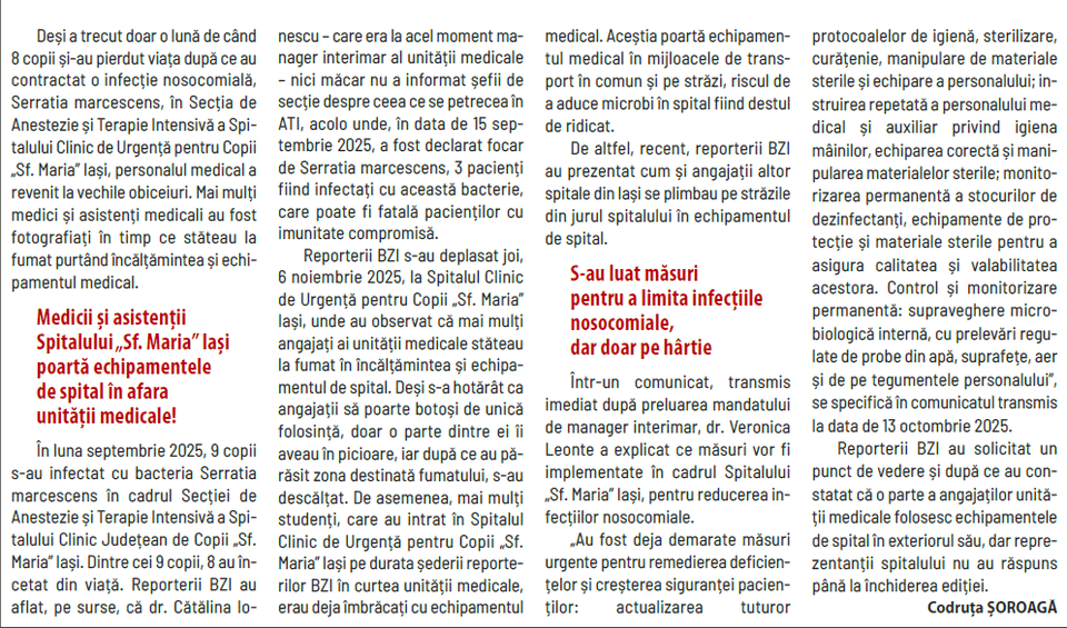 1. >Deși a trecut doar o lună de când 8 copii și-au pierdut viața după ce au contractat o infecție nosocomială, Serratia marcescens, în Secția de Anestezie și Terapie Intensivă a Spitalului Clinic de Urgență pentru Copii „Sf. Maria” Iași, personalul medical a revenit la vechile obiceiuri.
