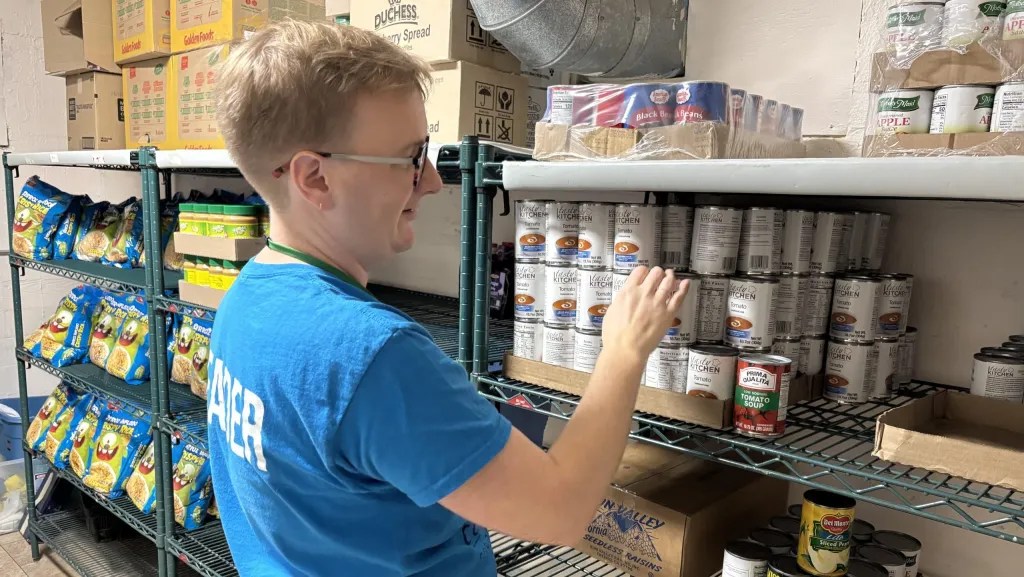 Connections’ Eli Cooper-Nelson, at food pantry in Hilda’s Place drop-in center, Lake Street Church. Credit: Jeff Hirsh