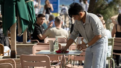 DVD 1287 11/10/25 Barcelona. Un camarero limpia una mesa de la terraza de un restaurante del paseo marítimo de la Barceloneta. [ALBERT GARCIA] EL PAÍS