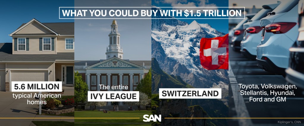 With $1 trillion, CNN wrote, you get get every single car sold in the United States this year. If cars aren’t your thing, you could splurge on 2,000 “Jeff Bezos yachts” — with the outlet noting that they take about $25 million in mainetance every year for each boat.