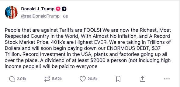 US-Präsident Donald Trump hat am Sonntag angekündigt, jedem US-Amerikaner 2000 Dollar aus den Einnahmen der Zölle auszuzahlen – mit Ausnahme von Wohlhabenden und Gutverdienenden.