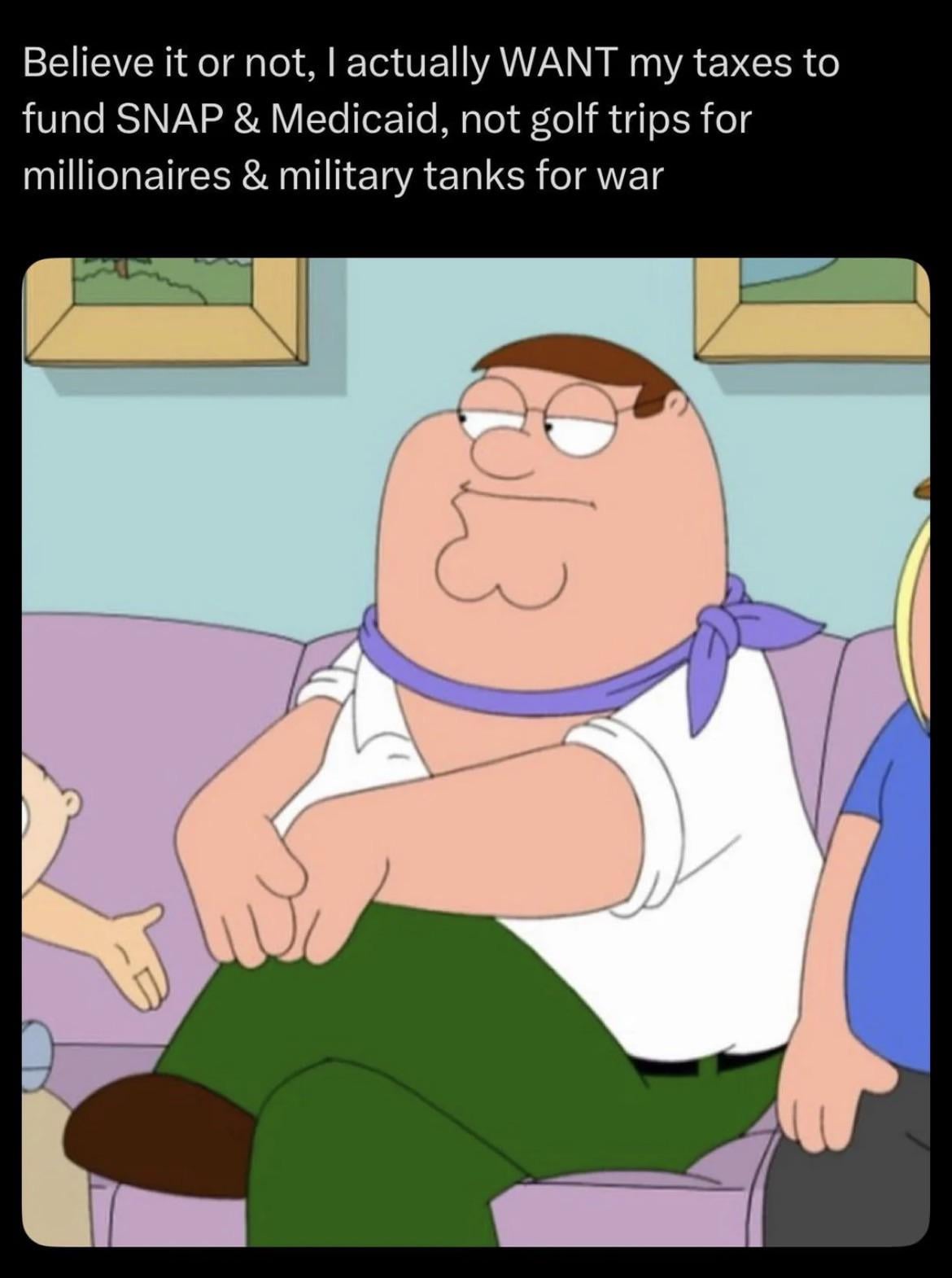Yeah but I think a lot of people want to pay for golf trips for millionaires and tanks for war… 😭