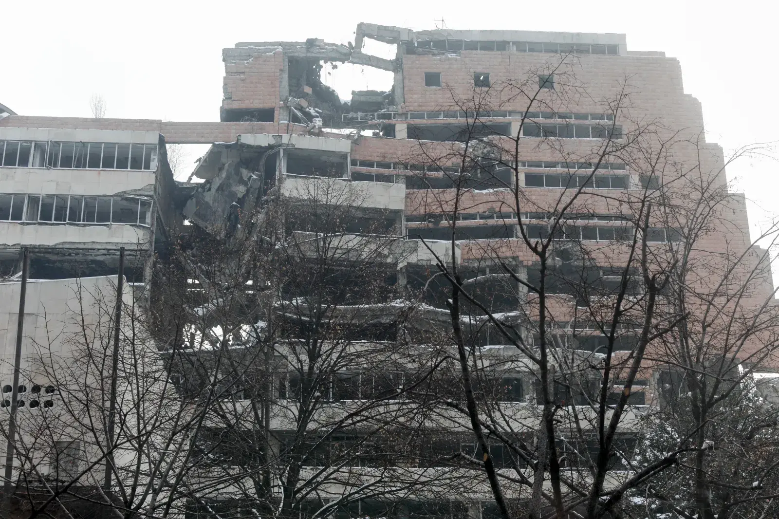 The former Yugoslav army headquarters known as the Generalstab was partly destroyed during NATO’s 1999 bombing campaign that ended the Kosovo war. The building was vacant at the time, when it was hit twice in the space of 15 minutes.