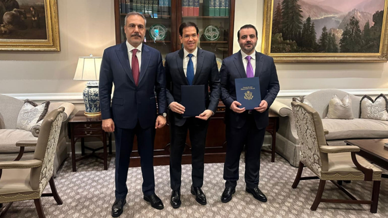 Turkish Foreign Minister Hakan Fidan (L), U.S. Secretary of State Marco Rubio (C), Syrian Foreign Minister Asaad Hassan al-Shaybani (R). (Photo: TRT)