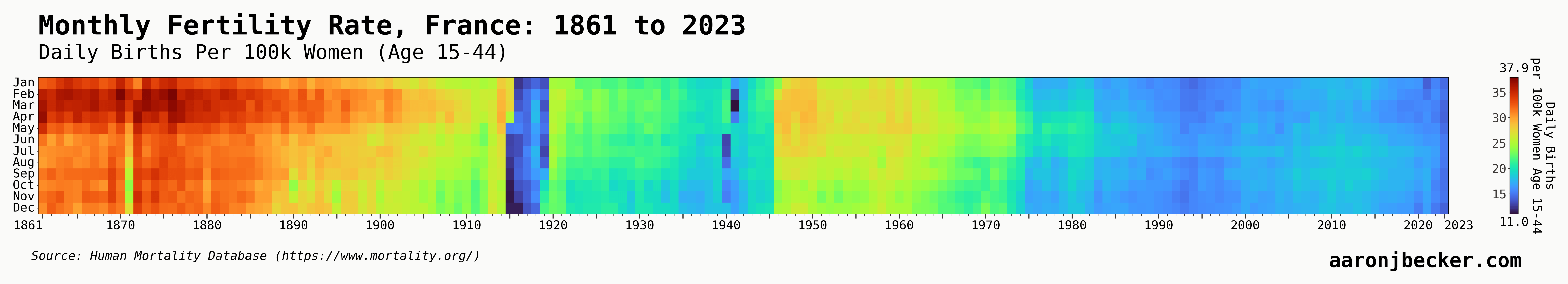 1. French fertility trends by month from 1861 to 2023. Warm colors = higher fertility rates, cool colors = lower fertility rates. More charts posted here as comments since Reddit is giving me a hard time with image uploads.