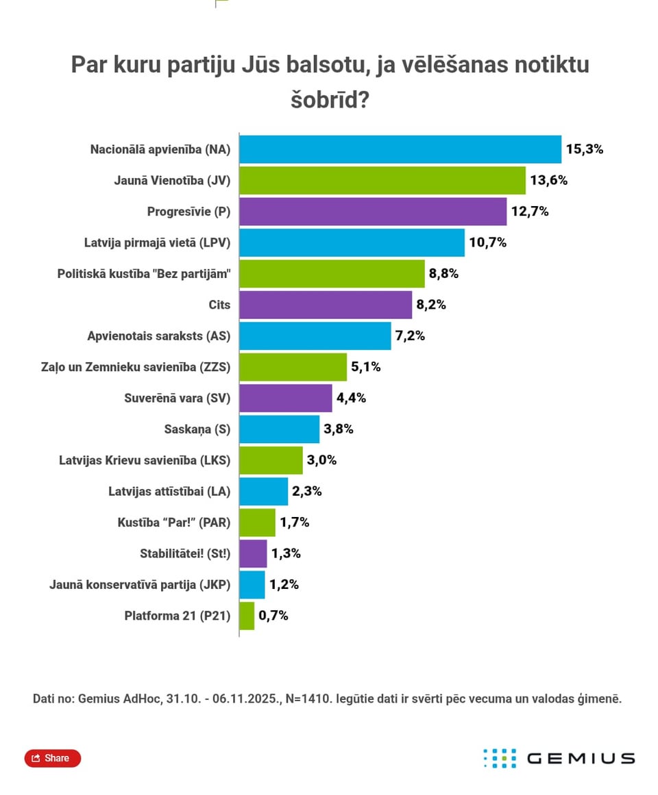 ⚠️ Gemius ir salīdzinoši zemas kvalitātes interneta aptauja. Gaidām SKDS, lai redzētu, cik dziļš ir kritiens.