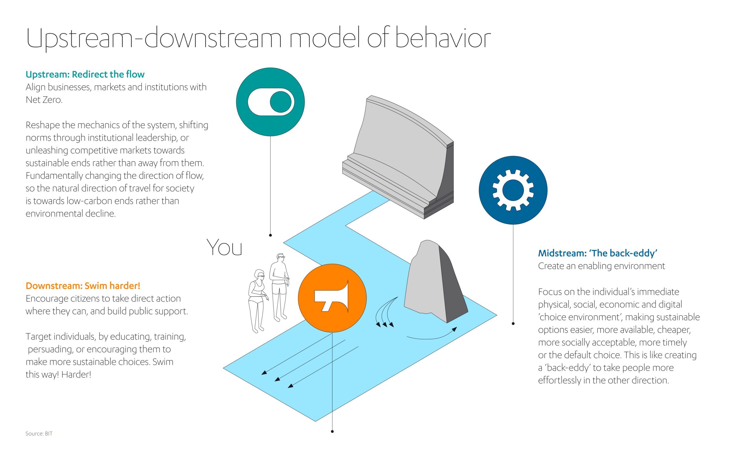 Rather than focusing on “downstream” interventions that directly target individuals, BIT emphasizes the “midstream” environments that people make choices within, and “upstream” factors which ultimately create those environments. It argues that by targeting people’s environment in this way, “greener behaviors can naturally flourish”.