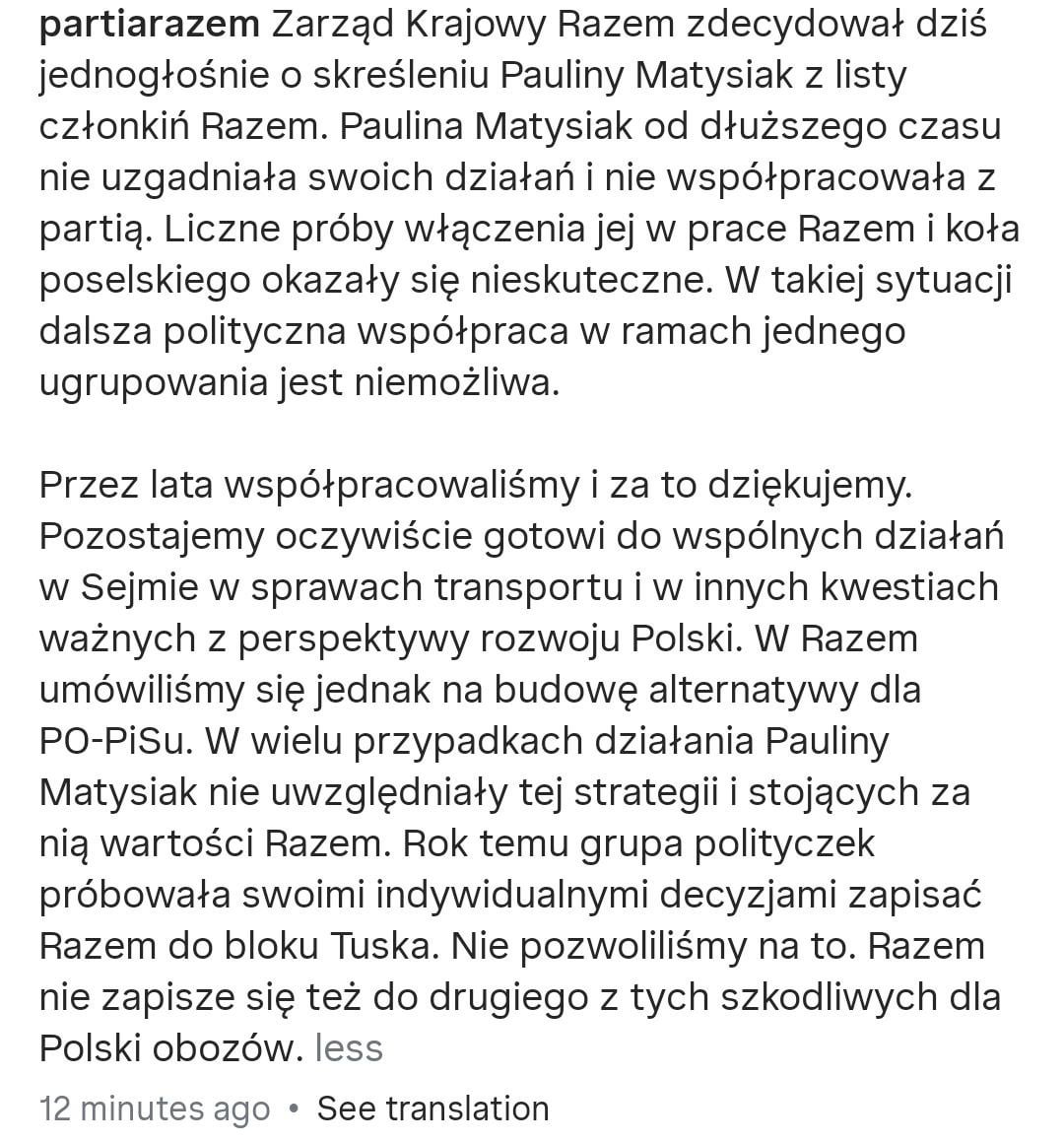 Czyli to by było na tyle, w 2027 do sejmu jeśli już to wejdzie to monstrum frankensztajna jakim jest Lewica, Razem pod próg, bo wywalą wszystkich nieczystych ideologicznie, karierowicze sami odejdą, a Matysiak na giełdę nazwisk, bo sama raczej nic nie zorganizuje. Szkoda, jedna z niewielu pozytywnych postaci polskiej polityki, która nie bała się podać ręki 2 stronie i robiła sporo dobrej roboty, jak z NEWAGiem.