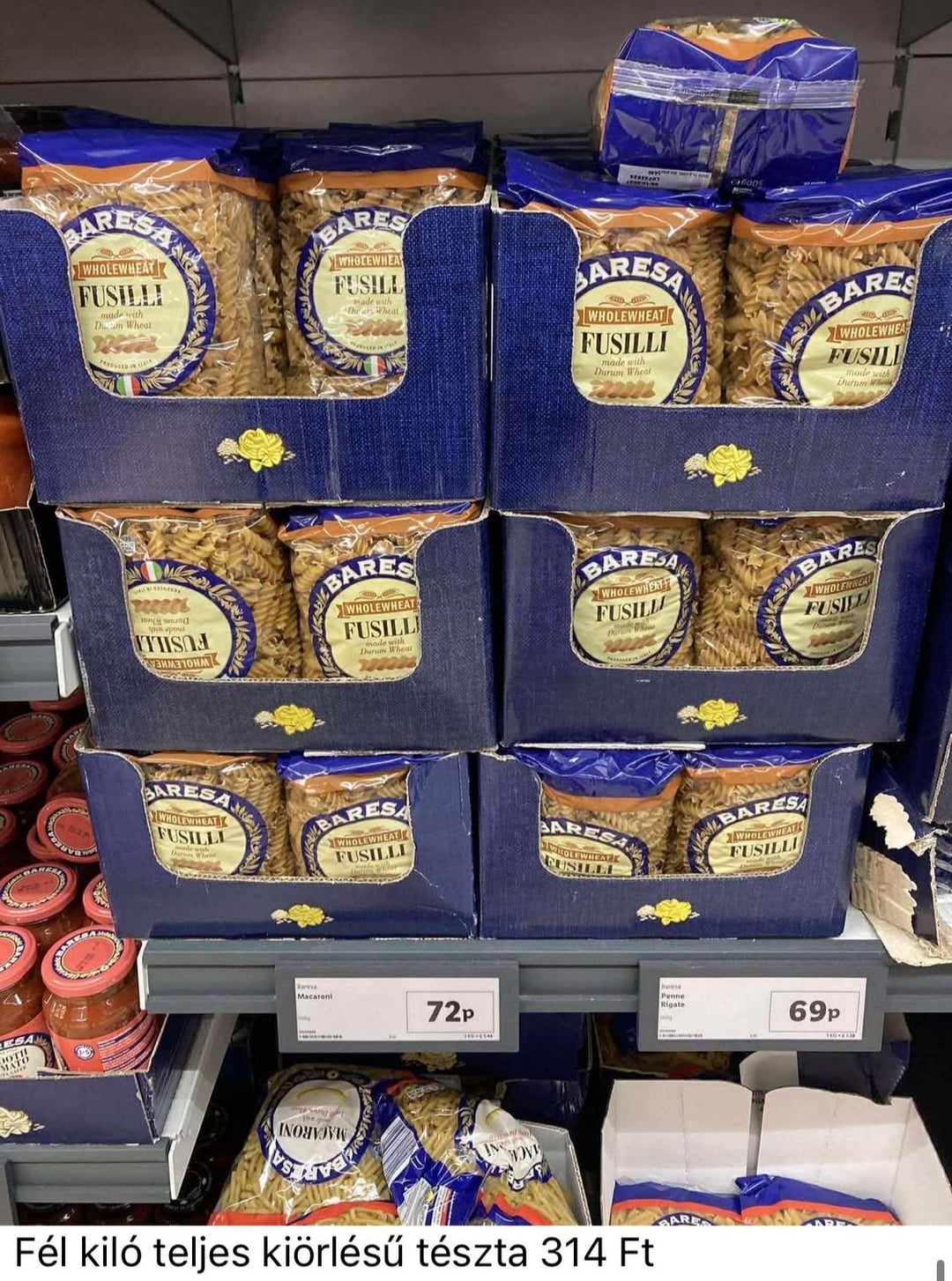 18 penny az 500 grammos spagetti, nekem ezt tavaly nem hittek el, le kellett fotoznom. Azota is tartja az arat.