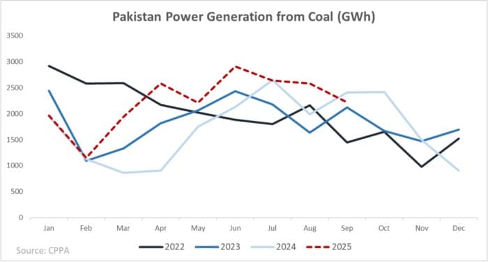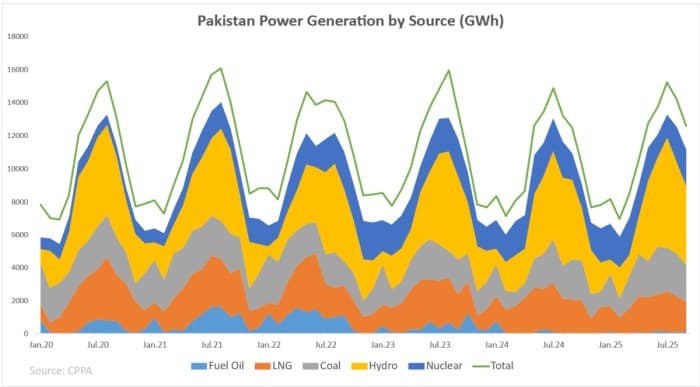 Coal and hydropower have emerged as the main alternatives. With international coal prices collapsing from an average of $400/t in 2022 to around $100/t in the first nine months of 2025, Pakistan has quietly increased coal’s role in its generation mix. Imported coal’s share rose from 25% to 27% in first 10 months of 2025, with about 70 % of total coal consumption now directed to power plants. The government has also encouraged greater use of domestic reserves, reducing reliance on imports from 60% in 2020 to roughly 25% in 2024. Most imported coal still arrives from South Africa (50-55%) and Indonesia (20%), but local output – particularly from Sindh Province’s vast deposits – is becoming increasingly significant. Pakistan’s recoverable coal reserves exceed 186 billion tonnes, 99% of which lie in Sindh Province, where the Sindh Engro Coal Mining Company (SECMC) operates mines producing about 7 million tonnes annually. Although domestic coal is lower grade in comparison with South African or Indonesian alternatives, its average price of $90-95/t makes it cheaper than imported fuel, reinforcing coal’s appeal as a base-load source.