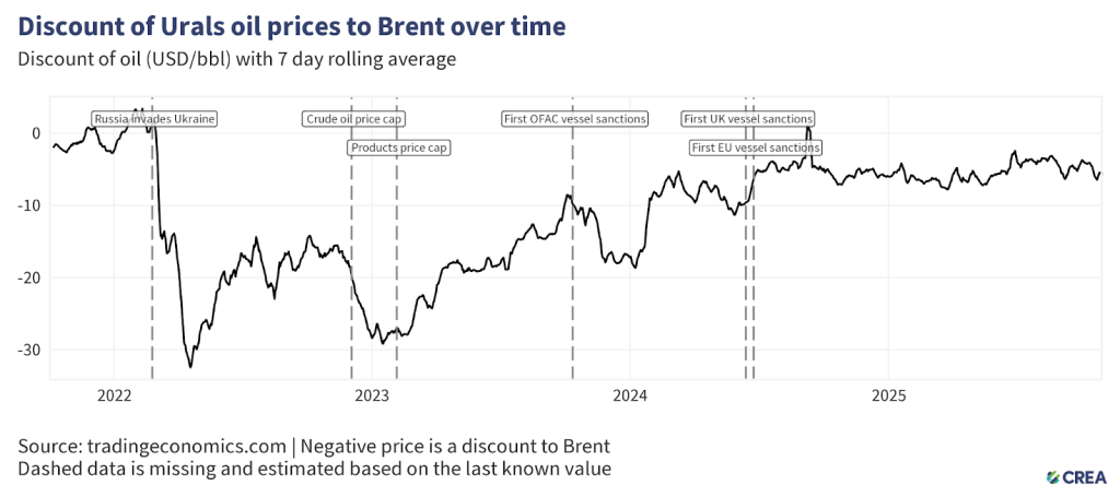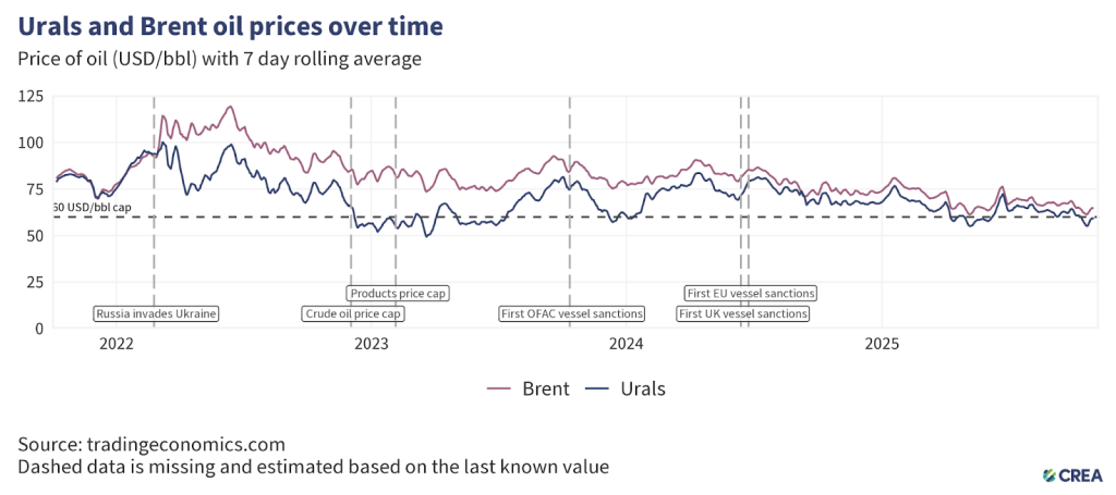 In October 2025, the average price of Russia’s Urals crude fell by 4% to USD 59 per barrel, remaining above the new price cap of USD 47.6 per barrel.