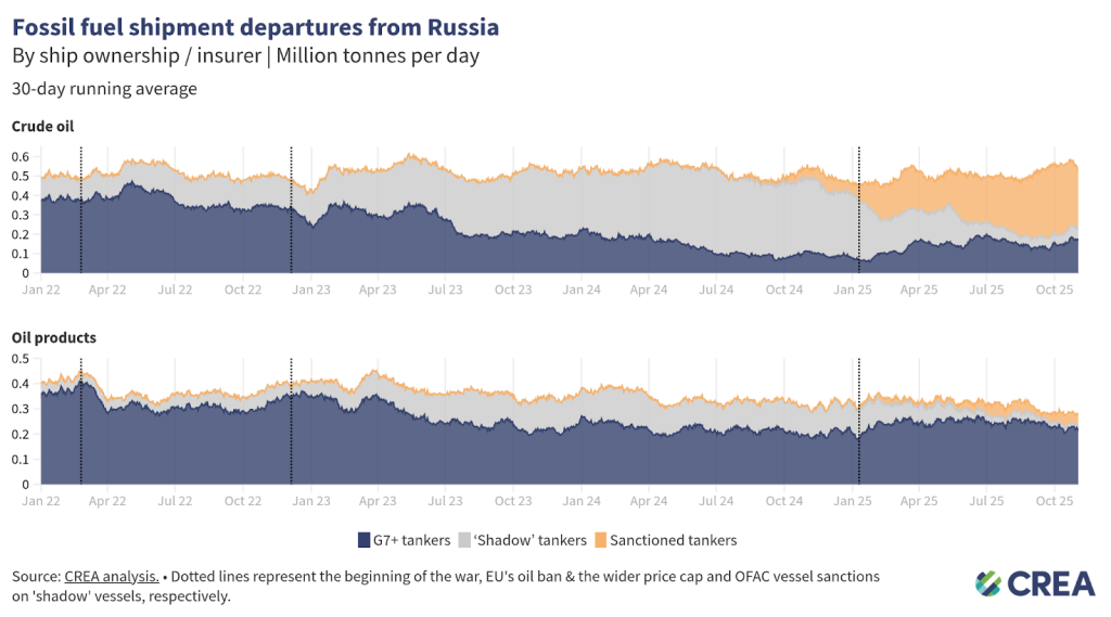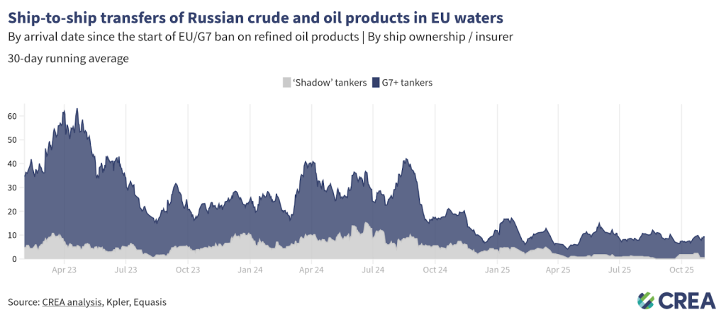 In October 2025, an estimated EUR 112 mn worth of Russian oil was transferred daily via ship-to-ship (STS) transfers in EU waters — a 35% month-on-month increase. G7+ tankers conducted 80% of these transfers, while the rest involved ‘shadow’ vessels, which are often uninsured or registered under flags of convenience.