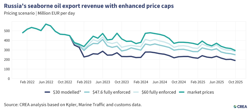 A lower price cap of USD 30 per barrel would have slashed Russia’s oil export revenue by 40% from the start of the EU sanctions in December 2022 until the end of October 2025. In October alone, a USD 30 per barrel price cap would have slashed Russian revenues by 36%.