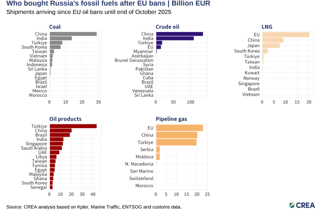 Russia’s fossil fuel exports remain highly concentrated, with China dominating coal and crude oil purchases, Turkiye dominating purchases of oil products, and the EU still the largest buyer of LNG and pipeline gas — showing Moscow’s dependence on a narrow set of key customers.