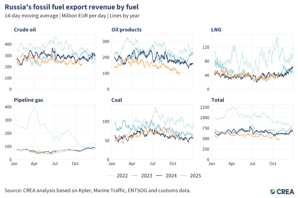 In October 2025, Russia’s monthly fossil fuel export revenues saw a 4% month-on-month decline to EUR 524 million (mn) per day — the lowest they have been since the full-scale invasion of Ukraine.