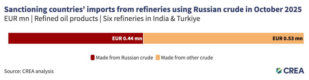 In October, the EU, Australia, the UK and the US imported EUR 971 mn of refined products from six Indian and Turkish refineries using Russian crude. An estimated EUR 443 mn of these products were refined from Russian crude.