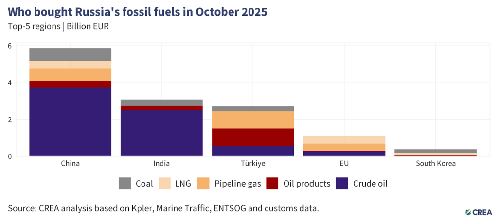 In October 2025, China remained the largest global buyer of Russian fossil fuels, accounting for 44% (EUR 5.8 bn) of Russia’s export revenues from the top five importers. Crude oil made up 63% (EUR 3.7 bn) of China’s purchases, followed by coal at 12% (EUR 704 mn), pipeline gas at 11% (EUR 668 mn), LNG at 7% (EUR 487 mn), and oil products at 6% (EUR 355 mn).