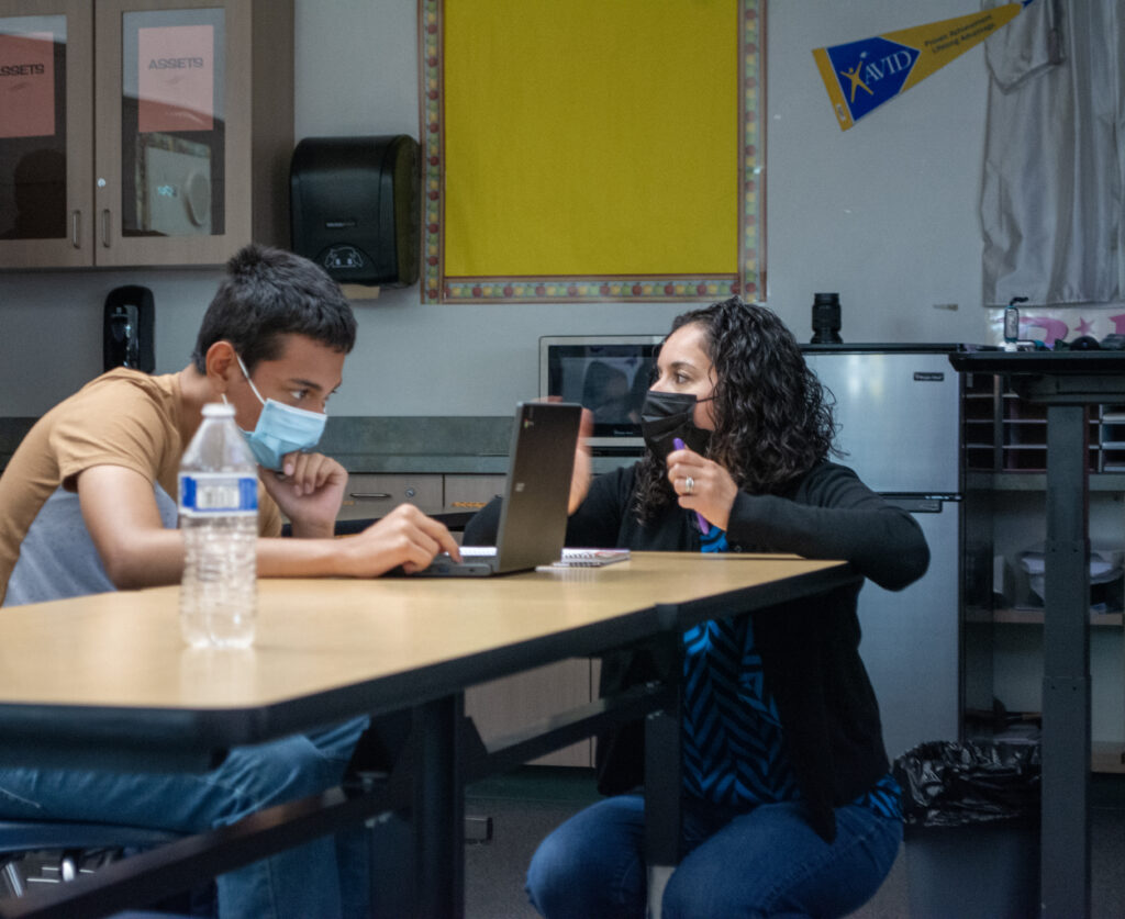 Elizabeth Alvarez, a teacher and parent in Livingston, works with a student at Livingston Middle School. Credit: Geneva Sum